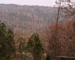 With the day passing along and the air much easier to breathe, we decided to play it safe and just head for the lake. We drove out of town and following her detailed instructions, pulled into a long line of cars waiting at the road construction site where they were clearing dead and dying trees from all of the insect mortality they have had. The wait probably wasn’t all that long, but it did seem long after all the driving and talking and deciding that had already been done and the arriving, site selection and setting up that still had to occur. It was getting to be a long day. Eventually we got the “all clear”, and road 221 twisted and turned us down off the ridge to the lake. We passed closed campground after closed campground until we finally saw some open gates at Lupine/Cedar Bluff campground. Home at last.