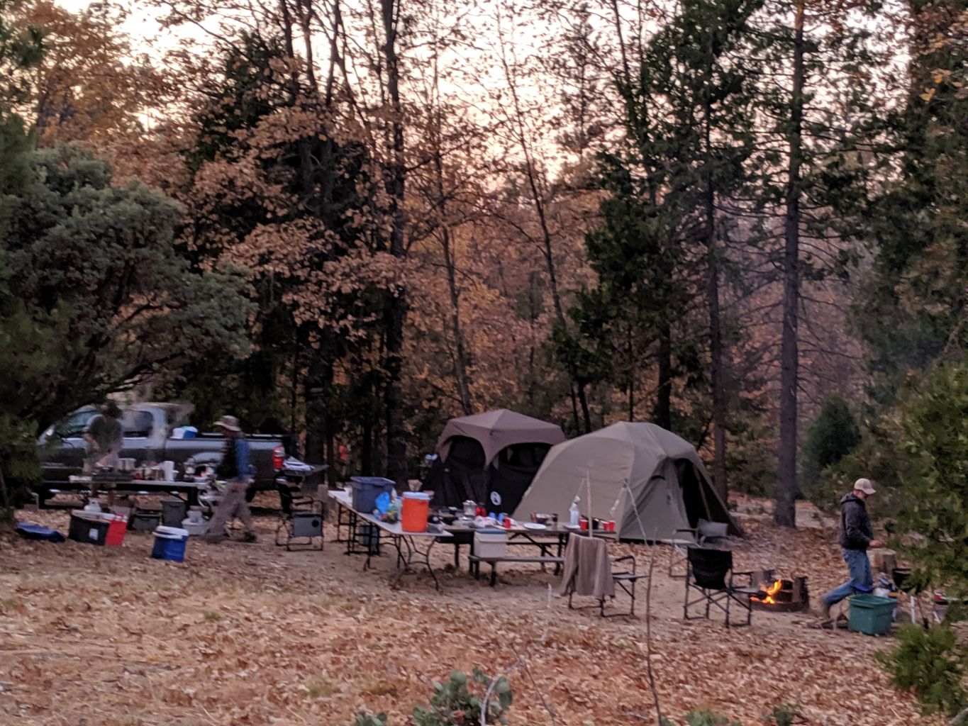 The morning was real nice. Calm, clear, and warm once the sun got on us. Fire and coffee were excellent. Kevin and Bob generally have more energy than most and they had spoken with a feller yesterday about a hike. They told us about a fire lookout that seemed appealing to us, so Bill, Tom, and I set out to find the lookout. We headed down to the Forks Resort, turned sharp left and headed out Road 426, Crane Valley Road. This brought us up to Road 223, Teaford Saddle Road. Not really seeing anything too promising, we thought we saw some towers on a ridge to the West so we headed down Road 236, Church Ranch Road, which brought us back to Highway 41 and into Oakhurst. Being at this massive intersection of Highway 41 and 49 was very strange; it just wasn’t the kind of setting we had in mind for a camping trip. Nonetheless, we found the visitors’ center that had a nice lady who had a forest service map. The only lookout near us was not so near us nor in the right direction. After carefully considering a tattoo or eyebrow stitching, we headed out of town.