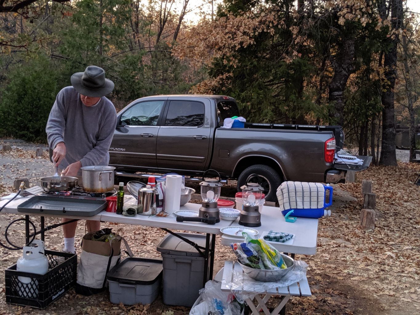 The morning was beautiful and after fire and coffee, I headed down to the lake. It was surprisingly close. Just across the road was essentially the shoreline and the water depending on the fullness of the lake. I headed out to a point that has an amphitheatre and got all toasty from the morning sun. I was a little hung, which I hate to get, but the Manhattans were flowing extensively. The coffee, fresh air, sun, and happiness to be out and about drug me out of the fog and into the light. Back at camp, there was talk of heading out for a day trip, possibly into Yosemite which was only an hour or so away. However, before anyone raised any amount of energy, we got a call from Bob saying he and Kevin were in Modesto, only about 2 hours away. We also had heard that Ken and Stevie G had bailed and were going to do their own trip closer to home.