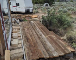 I started to fool with the cement piers I brought up to build a deck alongside the kitchen on the West side. We have planned on adding the Annex to the East side; about a 4’x 8’ extension off the deck and 42” wide stairs coming up from the trail alongside the new decking. But I had been using the West side as a shady morning spot, and storage, so it began to get used. Now I figured we should just build the “Western Addition” that would provide more flat space, more shade, another hang out spot, and possibly steps to tie in to the trailer and cabin below.
