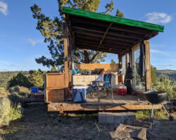 At any rate, we were done; both with the job and energy expended. It was time for rest and refreshments. Mike soon found his way to the trailer and I was jonesing for a shower. I was a little concerned about when the neighbors might roll up the hill, but I needed to be clean. I got all my gear together and clean clothes and cleaned up by the kitchen, and sure enough, up rolls a rig. I scrambled behind the kitchen to get clothes on and didn’t respond to Dale’s calls. Fortunately he headed to the trailer and woke Mike up, which gave me enough time to get dressed, just as they came up the trail. Dale quickly figured what had happened and we had a good laugh.