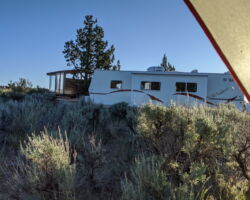 In the morning, despite it being the first thing I saw, the trailer did not look so massive or intrusive. I think being out in the open helps that too. Fortunately, I could still see the kitchen from my tent so it wasn’t like the trailer obliterated everything else and dominated the hill top. The area is just too big and open for that, so it had already begun to fit in. I got a fire going and coffee, made my morning constitutional, and greeted Mike as he emerged from the first night in the trailer. He was happy.