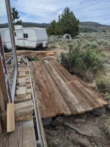 I started to fool with the cement piers I brought up to build a deck alongside the kitchen on the West side. We have planned on adding the Annex to the East side; about a 4’x 8’ extension off the deck and 42” wide stairs coming up from the trail alongside the new decking. But I had been using the West side as a shady morning spot, and storage, so it began to get used. Now I figured we should just build the “Western Addition” that would provide more flat space, more shade, another hang out spot, and possibly steps to tie in to the trailer and cabin below.
