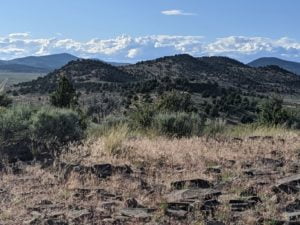 We soon realized this was going to be a job. The weather was great; not hot with a nice breeze, but the fencing was alternately buried in the ground or grown over by sage. We soon needed the axe to break off stout branches of sage to allow us to pull out the wire. Often times where the wire was buried, it rusted enough to break, so we found numerous sections that had varying numbers of strands. We would free a significant stretch of wire and then lift it over the sage to get it out nearer the property line as we saw it. We made it down most of the way, just about onto the flat ground at the bottom, when a white pick-up appeared on the road.