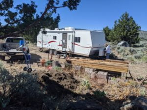 At any rate, we were done; both with the job and energy expended. It was time for rest and refreshments. Mike soon found his way to the trailer and I was jonesing for a shower. I was a little concerned about when the neighbors might roll up the hill, but I needed to be clean. I got all my gear together and clean clothes and cleaned up by the kitchen, and sure enough, up rolls a rig. I scrambled behind the kitchen to get clothes on and didn’t respond to Dale’s calls. Fortunately he headed to the trailer and woke Mike up, which gave me enough time to get dressed, just as they came up the trail. Dale quickly figured what had happened and we had a good laugh.