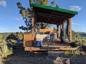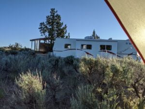 In the morning, despite it being the first thing I saw, the trailer did not look so massive or intrusive. I think being out in the open helps that too. Fortunately, I could still see the kitchen from my tent so it wasn’t like the trailer obliterated everything else and dominated the hill top. The area is just too big and open for that, so it had already begun to fit in. I got a fire going and coffee, made my morning constitutional, and greeted Mike as he emerged from the first night in the trailer. He was happy.
