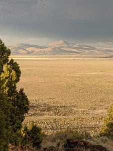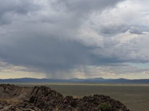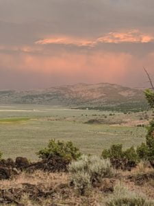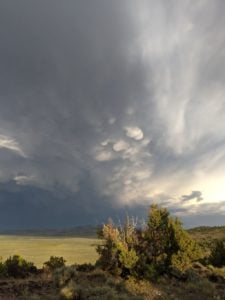 Periodically, I would remember to turn West and be reminded of the slender crescent moon setting in the gorgeous blue green Western sky. It was so calm and tranquil out West, so clear and soothing. One turn of the head to the East and I was fearing for my safety. The darkness of the clouds was intimidating; the bursts of lightning both entertainingly awesome and terrifying. I was looking for fires, listening for the thunder, concerned about the blasts of wind. I played my entire “Killers” library and finished my bottle of Zin. The storm was moving North behind McDonald Peak and seemingly joining another front to the North. Together they hammered the Warner’s and points NE. The show continued for four hours until I couldn’t stay awake any more. I had to get some sleep to prepare for the day ahead.