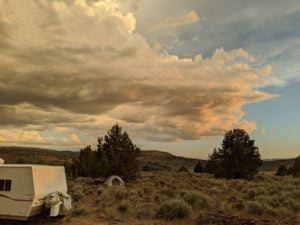 Hence, the prospect of sleeping in a two-sided tent had to be evaluated, alongside erecting the new tent I had with me for the first time. For one night, I elected the extra ventilation. My bed was set up in no time, but the dark part of the sky was getting much bigger, and closer, and the wind was picking up. I needed to eat so I set upon a can of Apricots and some saltine crackers. I was washing it down with the first Storelli-Hart on the property. It seemed comfortable. I changed into my long pants and shoes and socks, grabbed my jacket and hat just in case, emptied what I needed out of the truck. By 7:00-ish, I was settling in, although the weather was increasingly unsettling.