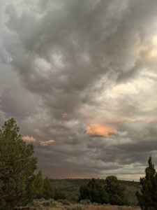 The percentage of the Eastern sky that was dark and stormy was increasing significantly. My eyes were glued to the size, darkness, and proximity of the mass. The wind had picked up considerably and I was evaluating options of running away screaming, curling up in a ball on the floor of the trailer, sucking my thumb inside the truck, or putting my diaper on and sitting it out. I drank more wine and took a few pictures and decided to stay put on the kitchen deck. I put on some calming music and looked West from time to time to stare up at the huge clear blue sky. It began to rage.