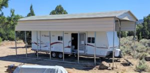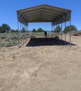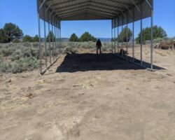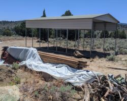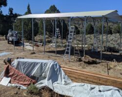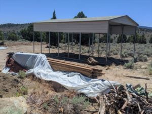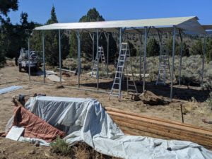 This was set to be another historic trip to the property, following the last trip where we had the fence and gates installed and the trailer came up. I had ordered a steel carport structure weeks ago and it was finally time for it to be installed Tuesday afternoon. We arrived Monday and unloaded and set up. It was a historic day as it was the first time I was setting up my new tent, the previous one getting baked into a brittle veneer having endured an entire summer on the Hill.