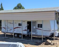 These guys didn’t miss a beat as they got right back to what they had been doing. Soon the frame was up and the cover pieces were going on. We brought them a jug of cold water but I don’t think they even touched it. Two more jobs to do today before they could head back to Fresno, to load up, and head out again. By 11:30, we had paid them, given them a handsome tip, and they were heading down the road. It was amazing to have the cover in place. Now all we needed was the trailer back underneath it.
