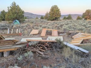 Be that as it may, the morning was calm and cool and we had coffee, fruit, and cereal, before I noticed Bobby hoisting his tool belt on. Let’s get it on! Bob chose the full length floor joists he wanted and we got them installed. Jenny had unrolled some chicken wire I brought up last time so we cut that into strips, then got to the 2 new rolls I brought up. We used every inch and had none left over. Then we headed down to the bone yard and grabbed an insulation burrito. We used every bit of the insulation wrapped up in that tarp and again didn’t have a shred left over. It was stunning how well things were falling in place. We stopped for a break and Bob was bemoaning his shorting the estimate on the plywood we needed for the flooring. He kept saying he couldn’t understand how he figured we only needed 3 sheets.