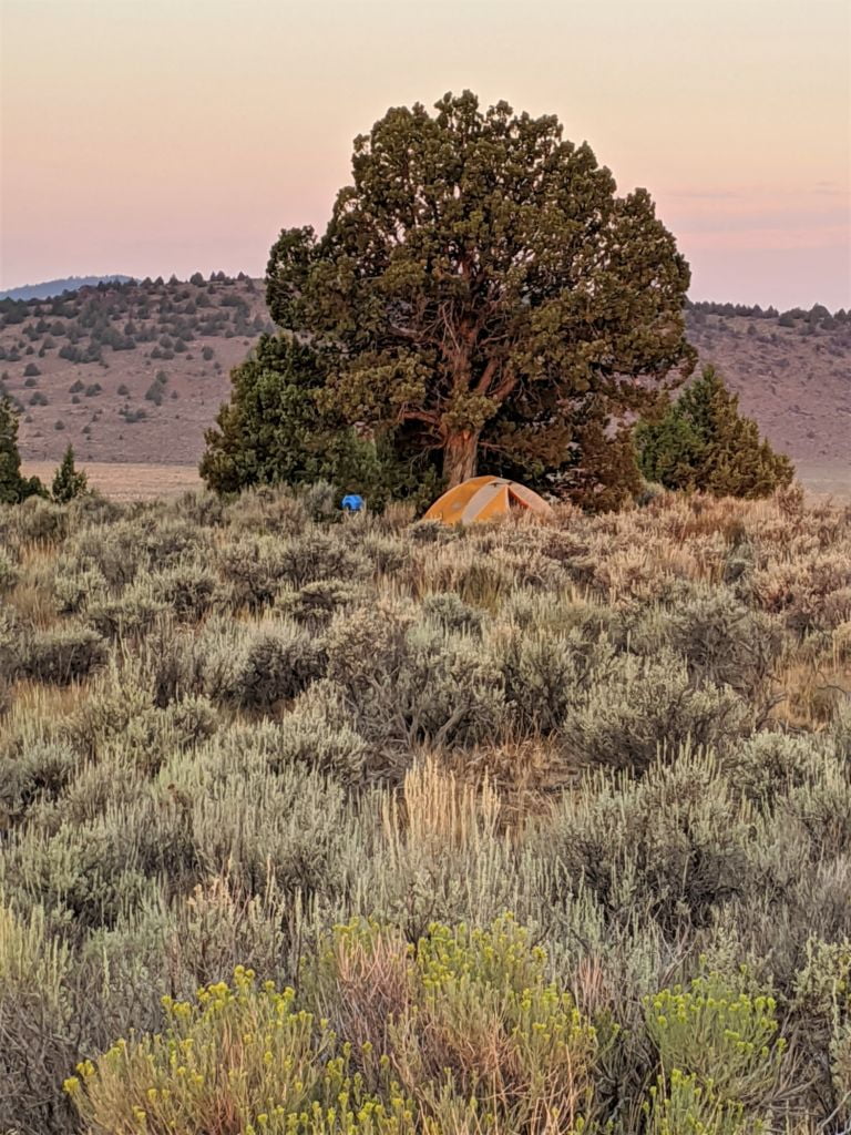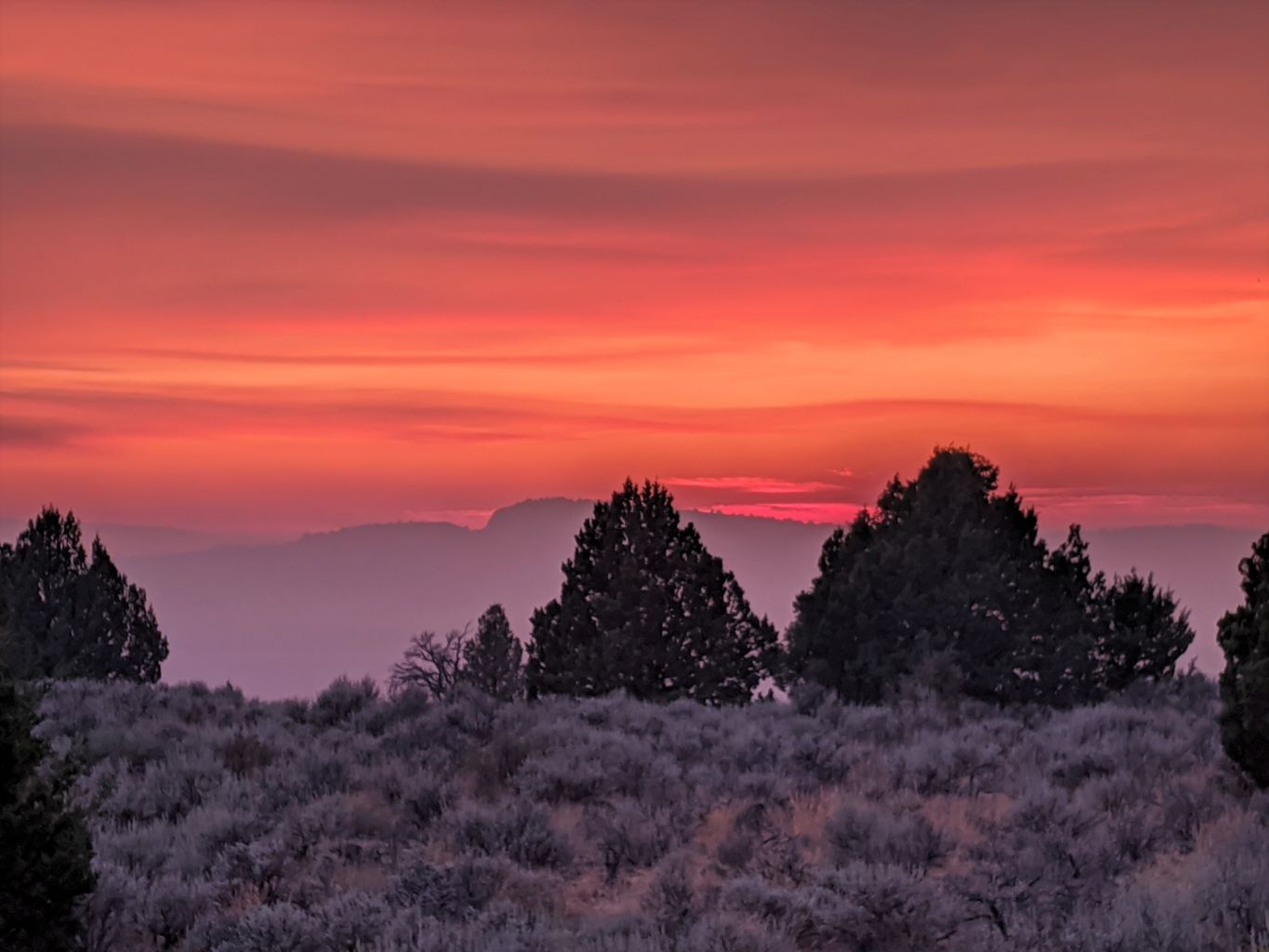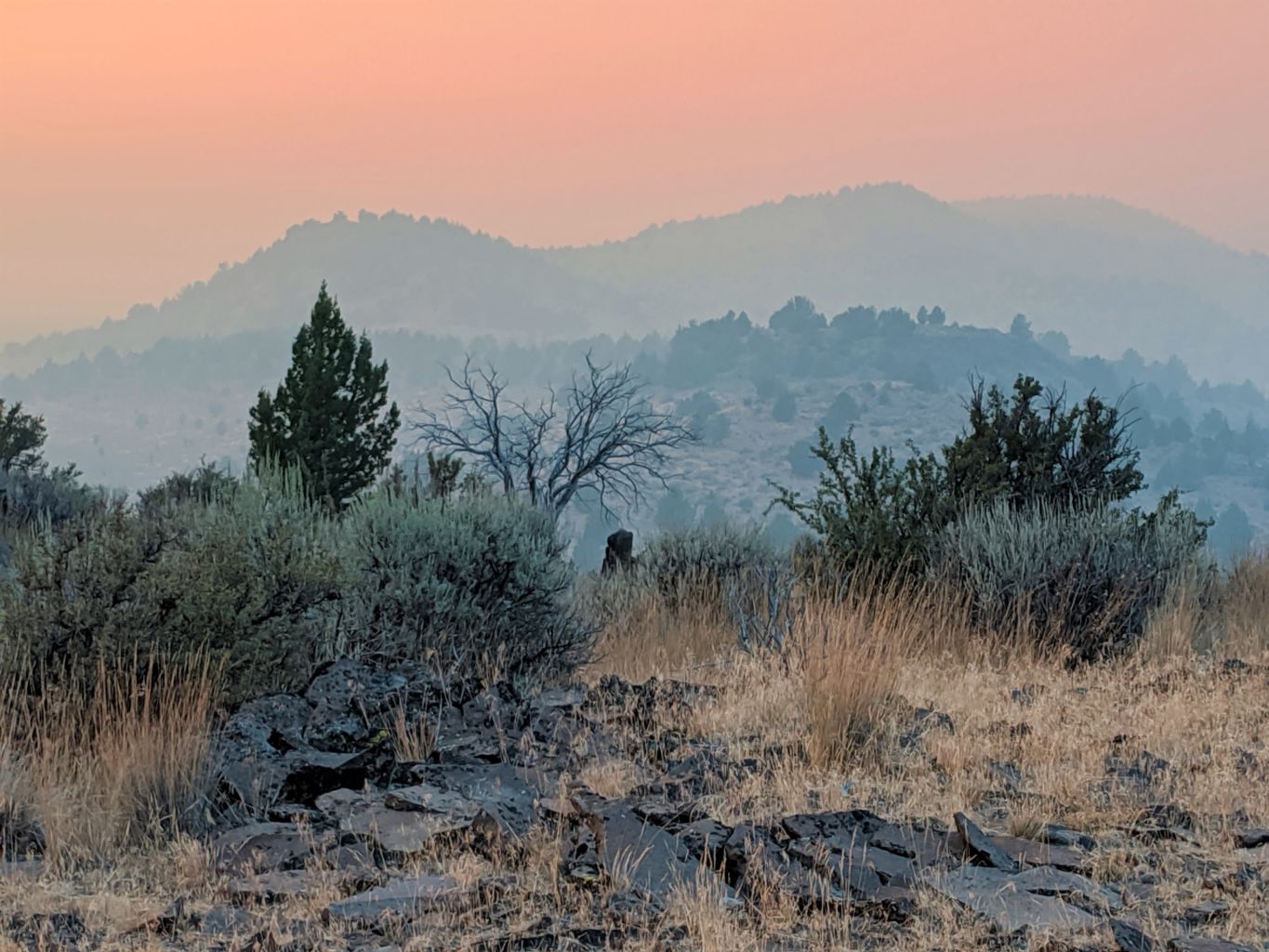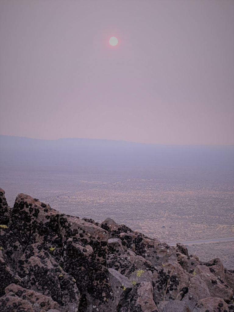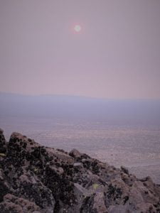 Bob heated up some pasta and we listened to some music for a bit and headed off to bed pretty early. No stars, no moon, no clovers. As with most fires, the cool temperatures and higher humidity of the night calms the fires down and therefore, release less smoke. In the morning however, when it warms up and air currents begin to move and the air gets drier, fire activity increases and the smoke generated increases. So it was all around us.