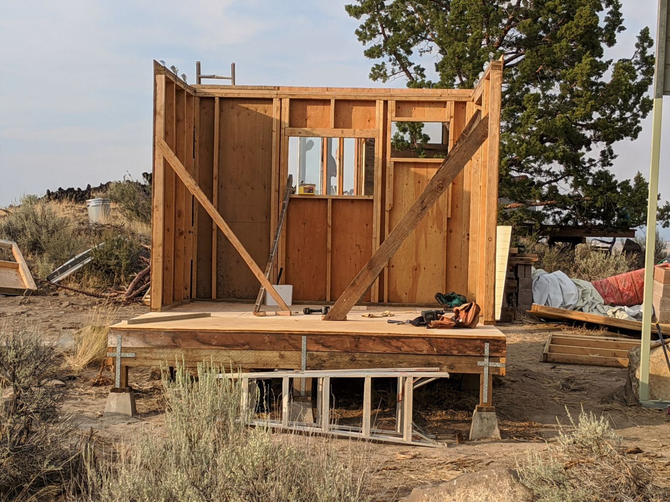Fortunately, moderation allowed for a clear and energized morning. I was stoked for the progress, to be headed home, and to have some time to address a few little things before I left. Bob helped me move the glass door to the cabin inside and the huge window over as well. We got the trapezoid window up on the deck where we can easily install it. Then he headed on down the road. I took a few minutes to take it all in and try to organize myself, but I was too excited to be able to get on all of these little projects.