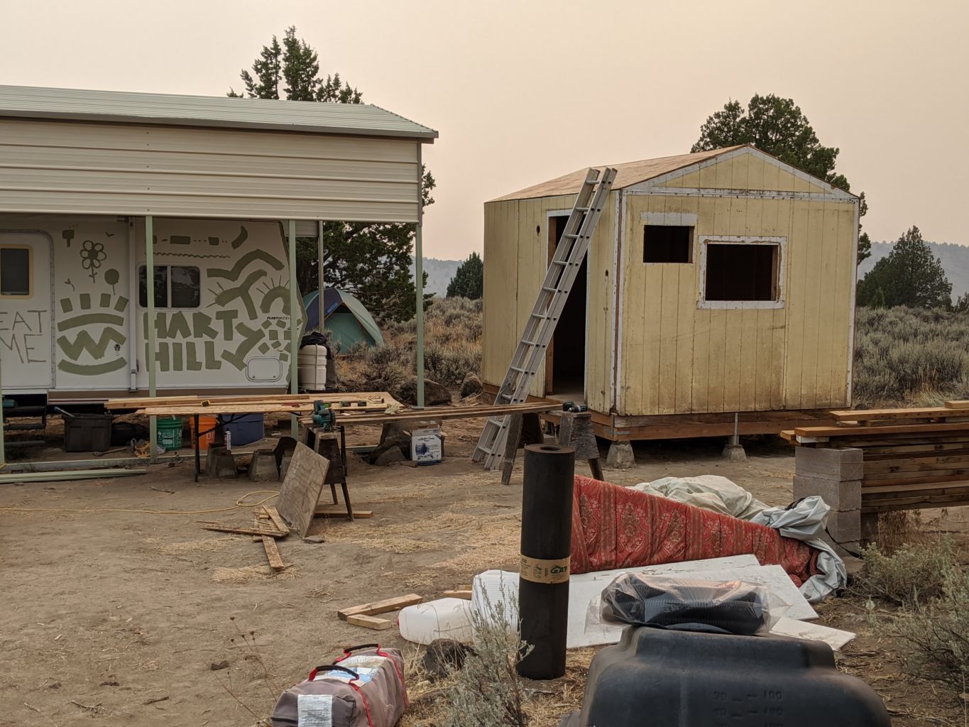Bob arrived a few minutes ahead of me and we both got to unloading. I was super excited to be back even thought the sky was a mucky beige gray and the smoke came and went. Kristen had left the tent up from last trip, so that part was pretty easy. I didn’t bring a massive load, so I was empty in no time and set about gazing at all we had accomplished last trip when the kids came up. It was quite a difference.