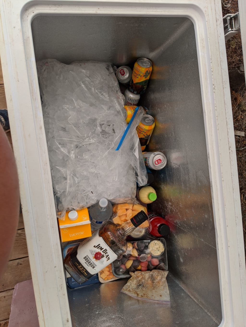 A lengthy shitter shower felt great, and clean clothes made me feel like a new man. Each time the cabin would catch my eye, I would get a huge grin and surge of satisfaction. We had done a lot of great work. Bob cooked up some burger and we added all sorts of onion, zucchini, taters, herbs and seasonings. The Storelli freezer still had solid ice, so our cocktails were quite enjoyable. I couldn’t stop eating until all of Bob’s brew was consumed; that is just how opposed to waste I am. Thankfully I did not take the same approach to the “Beam”, though it was dangerously close to being drained as well.