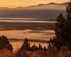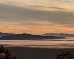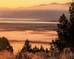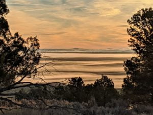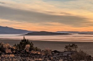 All 3 of us showered in the trailer this time. The water was a little short for 3, but we made do. I had the fire going and put on a Mark Knopfler album for the boys to enjoy while I showered and they chatted away. My brief rinse allowed me to get back to the fire in time to cook up Mike’s 2 steaks as Bob whipped up some pesto pasta. It was outstanding. I brought Bob down below the rock outcrop shelf on the Eastern side to show him a potential cabin spot and we basked in the warmth of the late sun and cocktails, tripping on the rock, the colors in the lichens, the vista out over the Madeleine Plain and up into the Warner’s. The air was incredibly clear; such a vast difference from all the smoke-filled days we had.