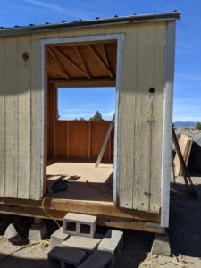 He plugged along on the door and casing, only to realize they must not have been originally used together. The hinges did not line up, so he had to move them and we didn’t really have the tools for that, so Bob being Bob, he gathered what options we had and improvised. Again, he was back on track in no time and we slipped the hinges together in their new locations. There was much rejoicing. Mike and I had done a fair bit of trim work and with all the windows and door in place, we were done for the day. It was awesome to see the cabin enclosed and looking like a complete structure.
