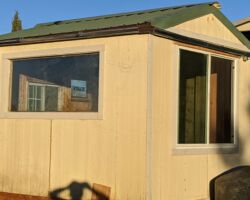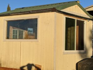 We then had trouble with the generator as it seemed the battery just wasn’t strong enough to kick it over. Fortunately, Mike was able to loosen the straps, turn it around to reveal a pull start. One tug and we were back in business, for a while anyway. We got the big Western glass in place and Bob got going on the glass door. Mike and I were going after all the trim and we were finding our groove, when the generator cut out again. This time, it seemed out of gas, but fortunately Bob had his battery operated circular saw which saved the day.