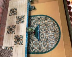 Upstairs and then up another flight of stairs, we came out onto a balcony which led to a very private courtyard. We again were facing East and I assume a couple floors above the dining room. There was a beautiful tiled fountain, bar, and potted plants all around. It was covered to provide shade and would also be an excellent location for a reception. We got to tour a couple rooms to show H&B the accommodations and rooms they could rent to stay, get ready, and use for guests, etc. It was very cool being led around to a number of patios, decks, and open spaces that could be used for any number of wedding related events.