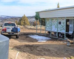Off they went, and back up top we went to finish washing up and getting something to eat. I made a little fire and we sat around and reviewed the topics of the day. It was great to just sit in the sun and be warmed by the fire. Eventually we figured we better get to it and started to fool with leveling the trailer and setting it on cinder blocks. Mike got out his jack and we raised the stabilizer legs, let out the air in the tires, and let her sit down on the blocks. We put a wooden block on top of each one that we could later attach a plywood skirting around the bottom to minimize the cold air blowing around under there.
