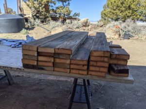 I grabbed the peeler posts and cut them to length with the sawzall because I couldn’t get the stupid chain saw to start even though I used it the day before. So frustrating! I laid them out on the ground spaced about 2 feet apart so that we could have a step or 2 down to more deck, or like an old wooden sidewalk to the back of the trailer. Eventually, we hope to place a shower platform at the back of the trailer for the outside shower and it will all connect with the decking.