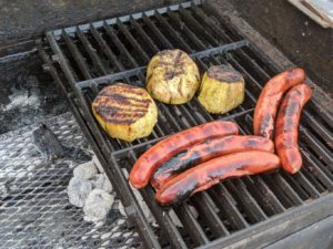 Of course, my lunch time lingered and beverages flowed, and the front of the cabin had the most trim, especially around the door, but I was buoyed by the thought of having it completely done. The timing was perfect and it looked pretty good. I was really happy with the filling capability of the paint, it sealing up many gaps and blemishes, and giving it a clean consistent color. I had time for a celebratory cocktail, a good cool shower at the kitchen tank, clean clothes, and on to dinner. Steve had told me how to prepare and BBQ eggplant so I was really looking forward to that, as well as some good hotdogs.