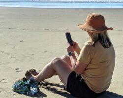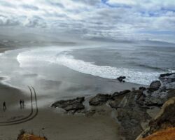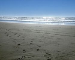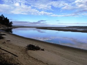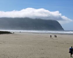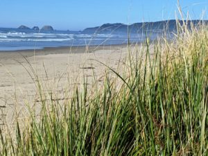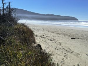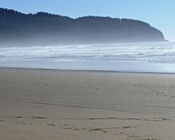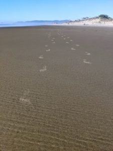 Looking at Googly now, I see this spit went for 5 miles to the mouth of Netarts Bay, just a sand strip about 500’ wide with a strip of coastal vegetation on the east side shaped like a lamb rib, super narrow at the campground end and fairly substantial by the time you get to the mouth of the bay. With the sand so fine and firm, it would have been great to get to the mouth, but that will have to wait for another day. We had a wonderful walk along the beach; a perfect re-introduction to the coast and a perfectly relaxing afternoon.
