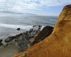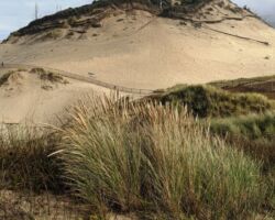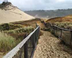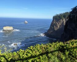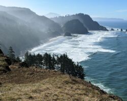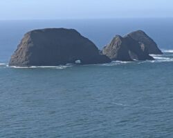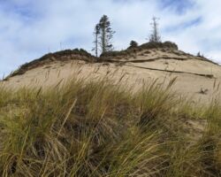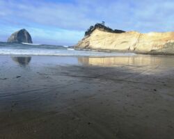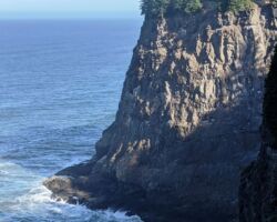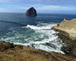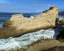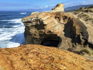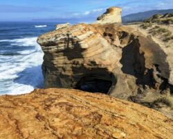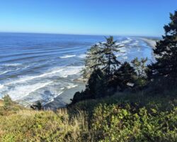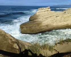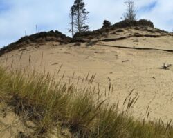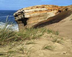 We headed to the beach and then up the massive sand dune up to a sandstone point, 1 of the 3 Capes as they call them, Kiwanda along with Lookout, and Meares. The vistas of the ocean, beach, ton, and forested mountains from up top were incredible. We lingered quite a while, waiting for the hawk to fly out of the tree, and even got to see a dory boat come in. It was a great stop.