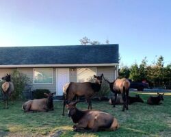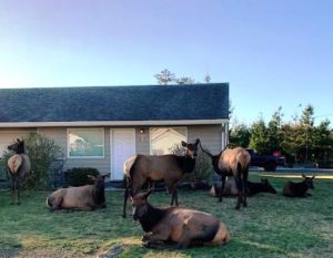 It was getting late and we had to cross over the Columbia into Washington for the night. We cruised a few campgrounds, but missed pretty much all of the historic Fort. Nonetheless, it was very beautiful and green and wet. I wondered if moose ever come this far South, but I knew it must be Elk country. I just mentioned to Kristen that I would love to see some elk, but we had left the park and entered the residential neighborhood of Warrenton. As we were cruising down main street starting to look for signage to get back on 101 and head to Washington, like a natural history display not 10 feet from the road is a group of 10 or so elk.