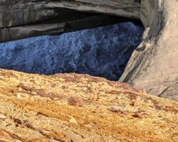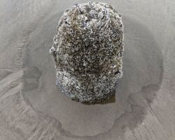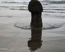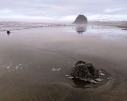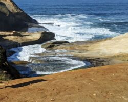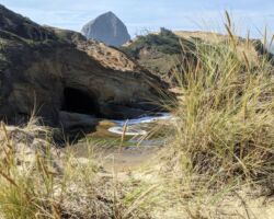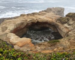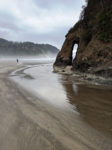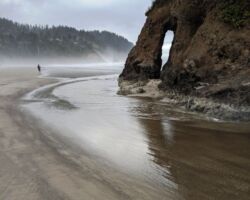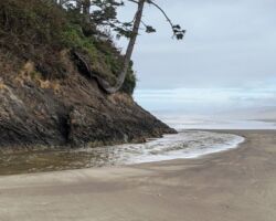 We gave it a good try, but with the day getting pretty long, we just stopped and parked, and walked down the trail and stairs to the sandy strip of Neskowin Beach. Proposal Rock sits on the beach, a very cool and rather different kind of lone island or stack because it is literally on the beach; it isn’t inaccessible out in the water surrounded by waves and surf. Neskowin Creek runs right to it, across the sandy beach but on the surface, nt absorbed into the sand. When it hits Proposal rock, it splits in half, some of the creek going around the North side of the rock and some very equal amount heading around the south apron.