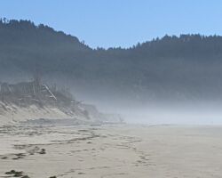 Sleep was excellent and the rain we expected in the morning proved to barely be a heavy dampness. I had a nice hot shower in the dank, well-used shower house, and we were on our way, past Netarts Bay, into Netarts and the Schooner Restaurant and Lounge. I was looking for breakfast on the water, and this was the perfect place, but often passing up a perfect place for a more perfect place, I passed her by. We drove through what there is of town, and seeing nothing, relented and returned to the Schooner, only to find it closed.