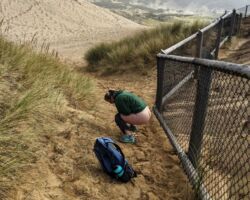 Further down the coast, we came to Pacific City and K wanted a coffee. This was a popular spot with a lot of people and traffic and pedestrians and no parking, but K got her fix and I eventually realized this was another spot I wanted to explore. We crossed over the road to a huge parking lot at Cape Kiwanda State Natural Area. We stopped to read about the Dory boat fishing fleet being launched from this beach by hand and riding the waves back in right up onto the beach. There is no dock or marina; they just rides the waves, although not rowing by hand anymore, as they first did in 1887.
