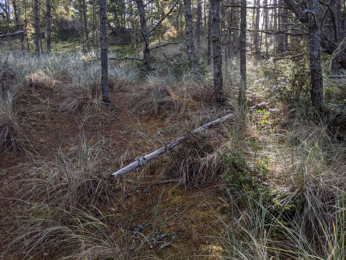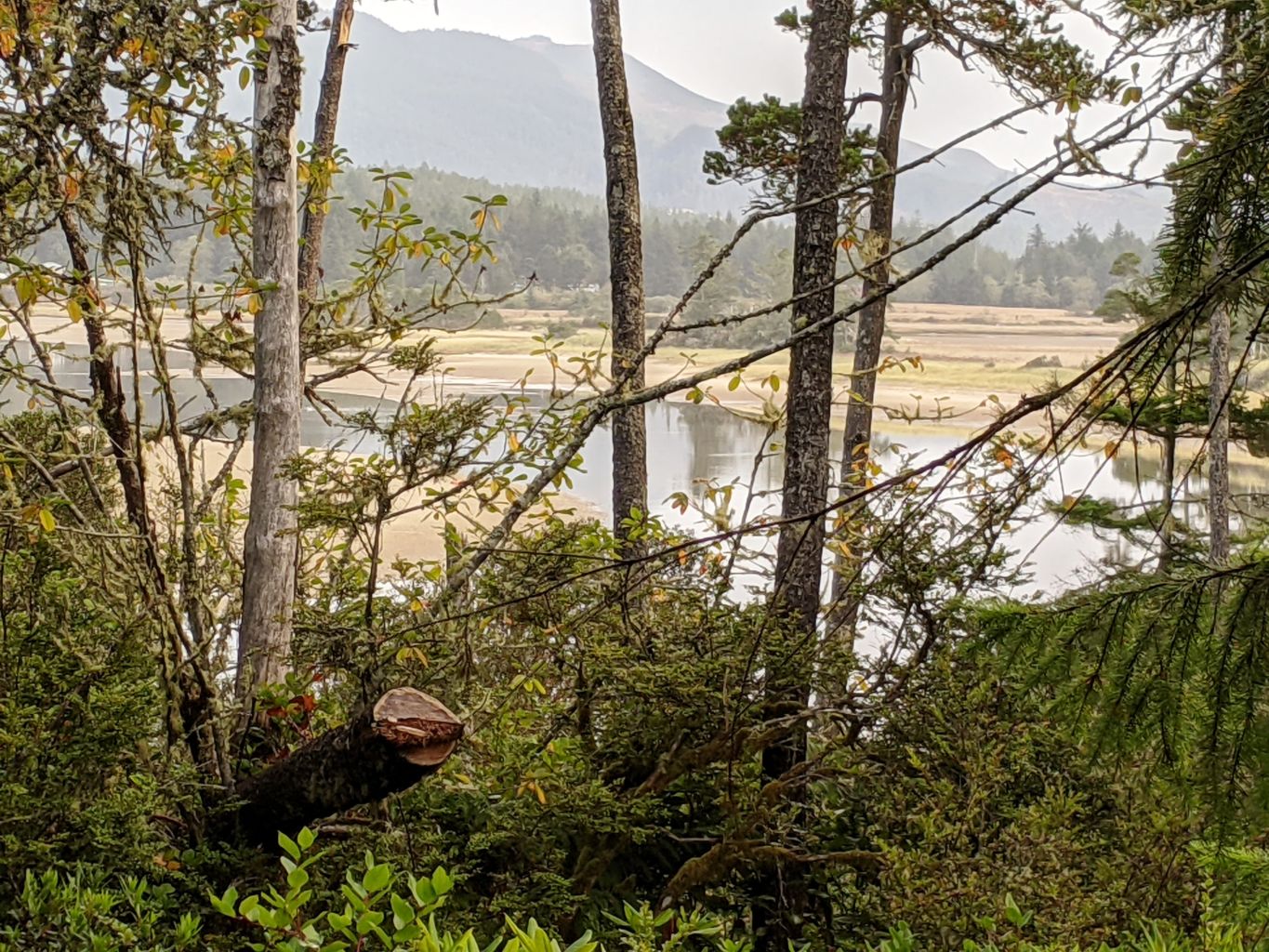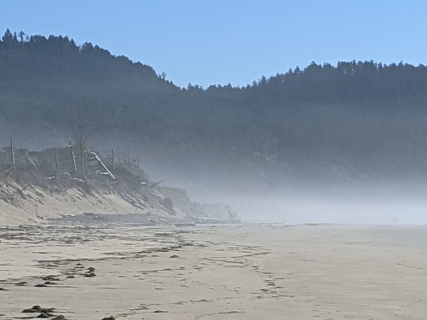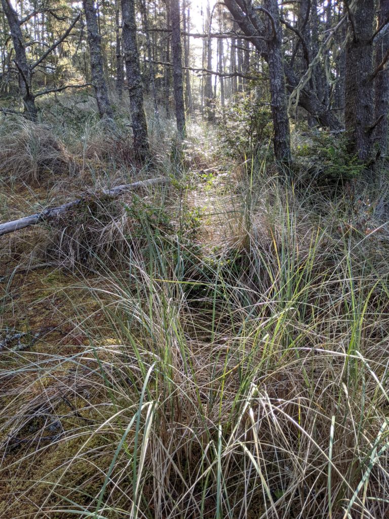 We took a nice couple mile loop trail through forest, and meadow, and finally along Sand Lake, another of those Oregon coastal oddities; uncertain if it is bay, river, marsh, wetland, estuary, all completely impacted by the tides, they are of immense beauty and tranquility, especially in the calm, cool, misty early morning. Despite not knowing if we were on a trail, or on the right path most of the time, we found our way and had a great morning stroll.