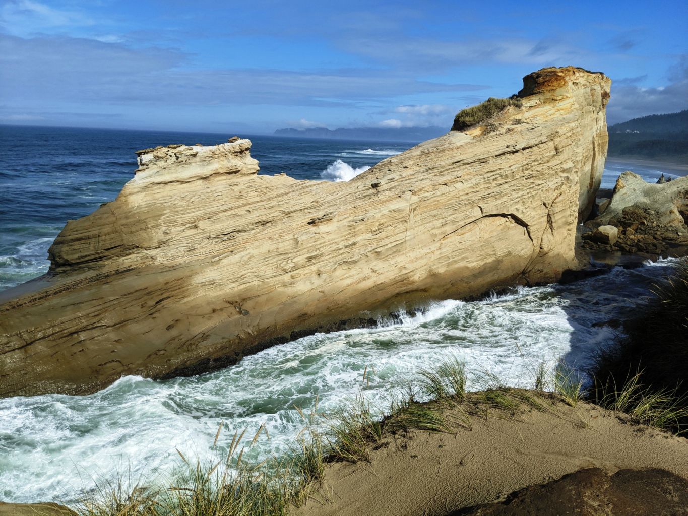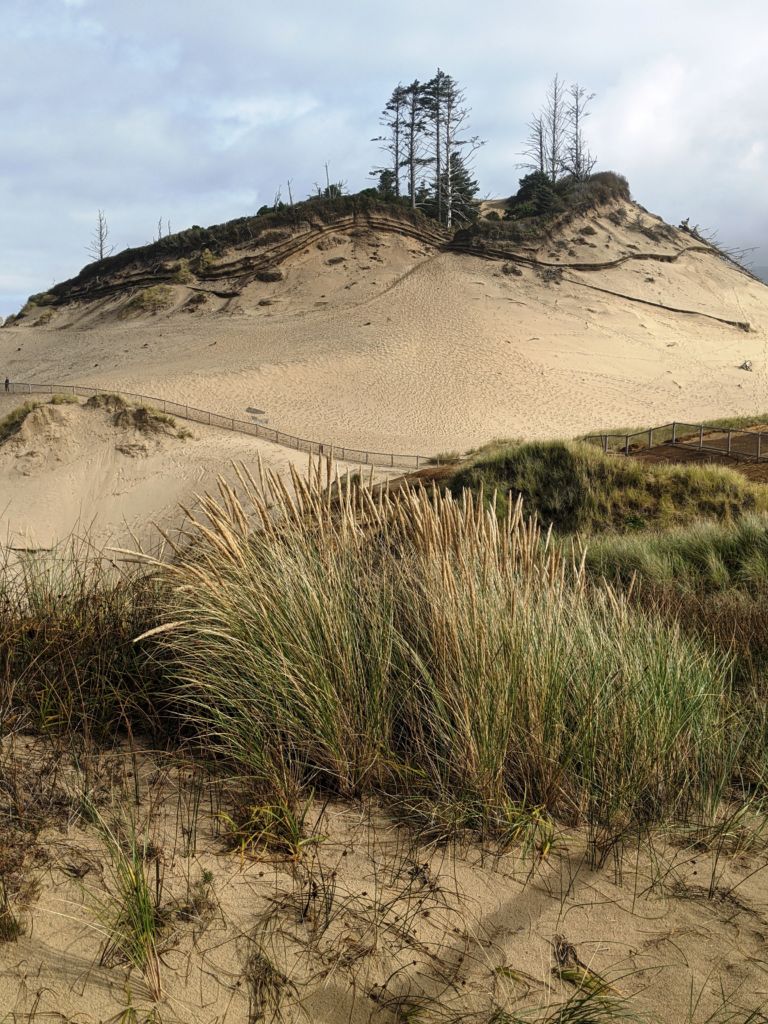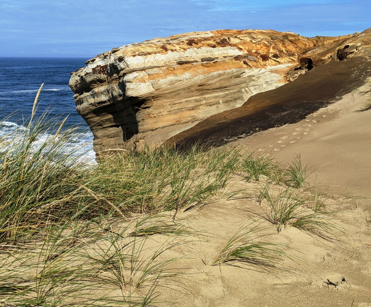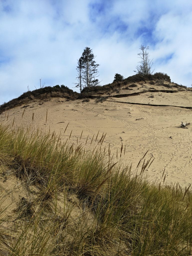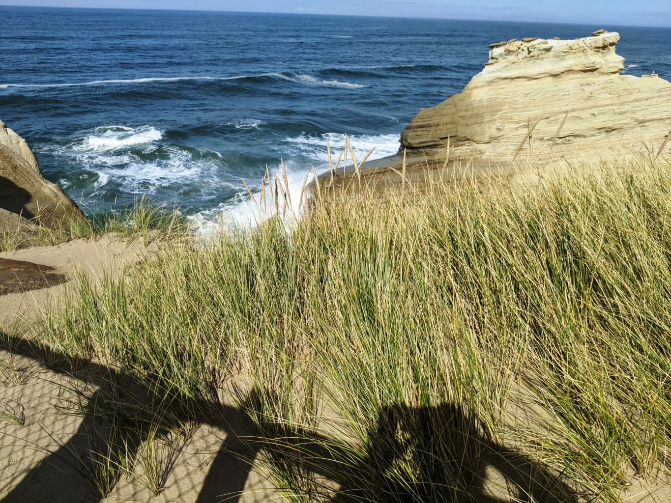 We headed to the beach and then up the massive sand dune up to a sandstone point, 1 of the 3 Capes as they call them, Kiwanda along with Lookout, and Meares. The vistas of the ocean, beach, ton, and forested mountains from up top were incredible. We lingered quite a while, waiting for the hawk to fly out of the tree, and even got to see a dory boat come in. It was a great stop.