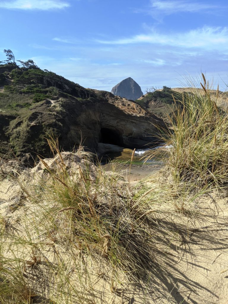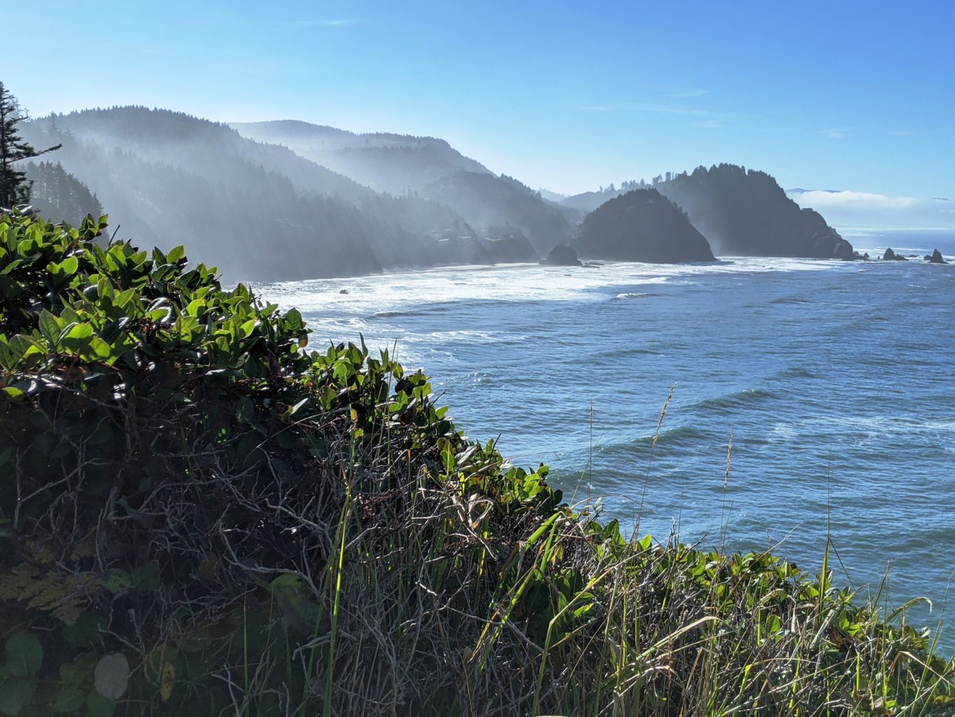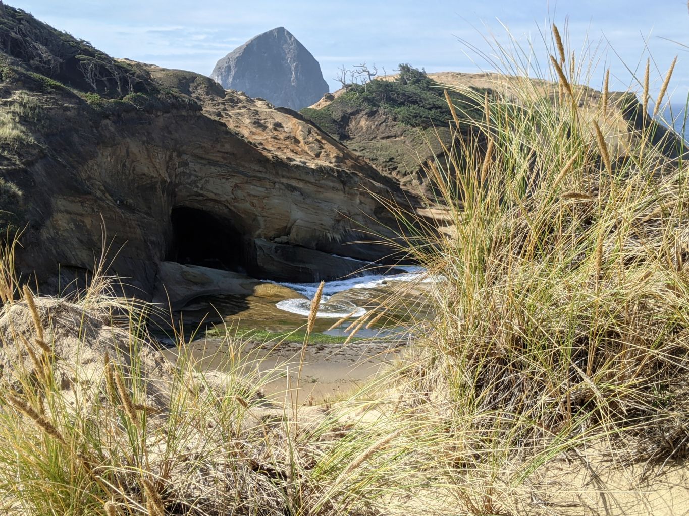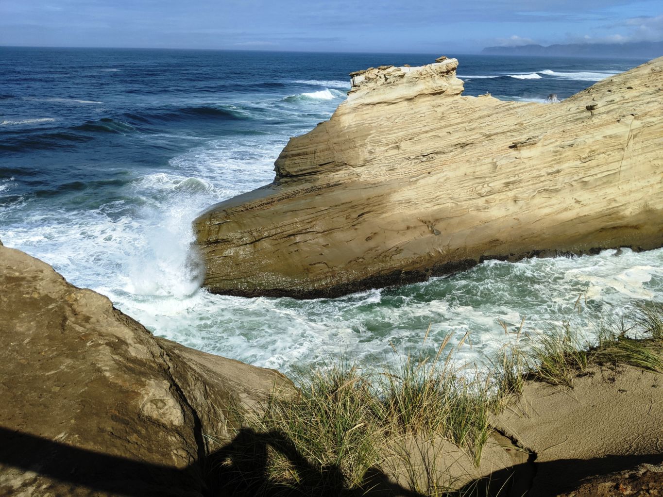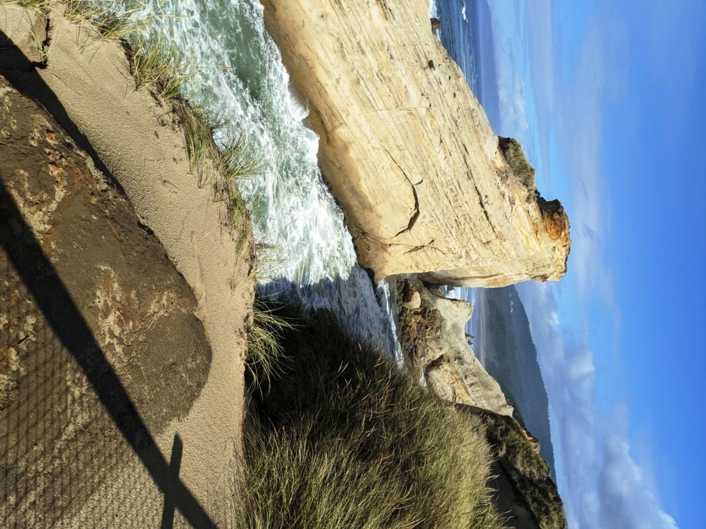 We headed to the beach and then up the massive sand dune up to a sandstone point, 1 of the 3 Capes as they call them, Kiwanda along with Lookout, and Meares. The vistas of the ocean, beach, ton, and forested mountains from up top were incredible. We lingered quite a while, waiting for the hawk to fly out of the tree, and even got to see a dory boat come in. It was a great stop.