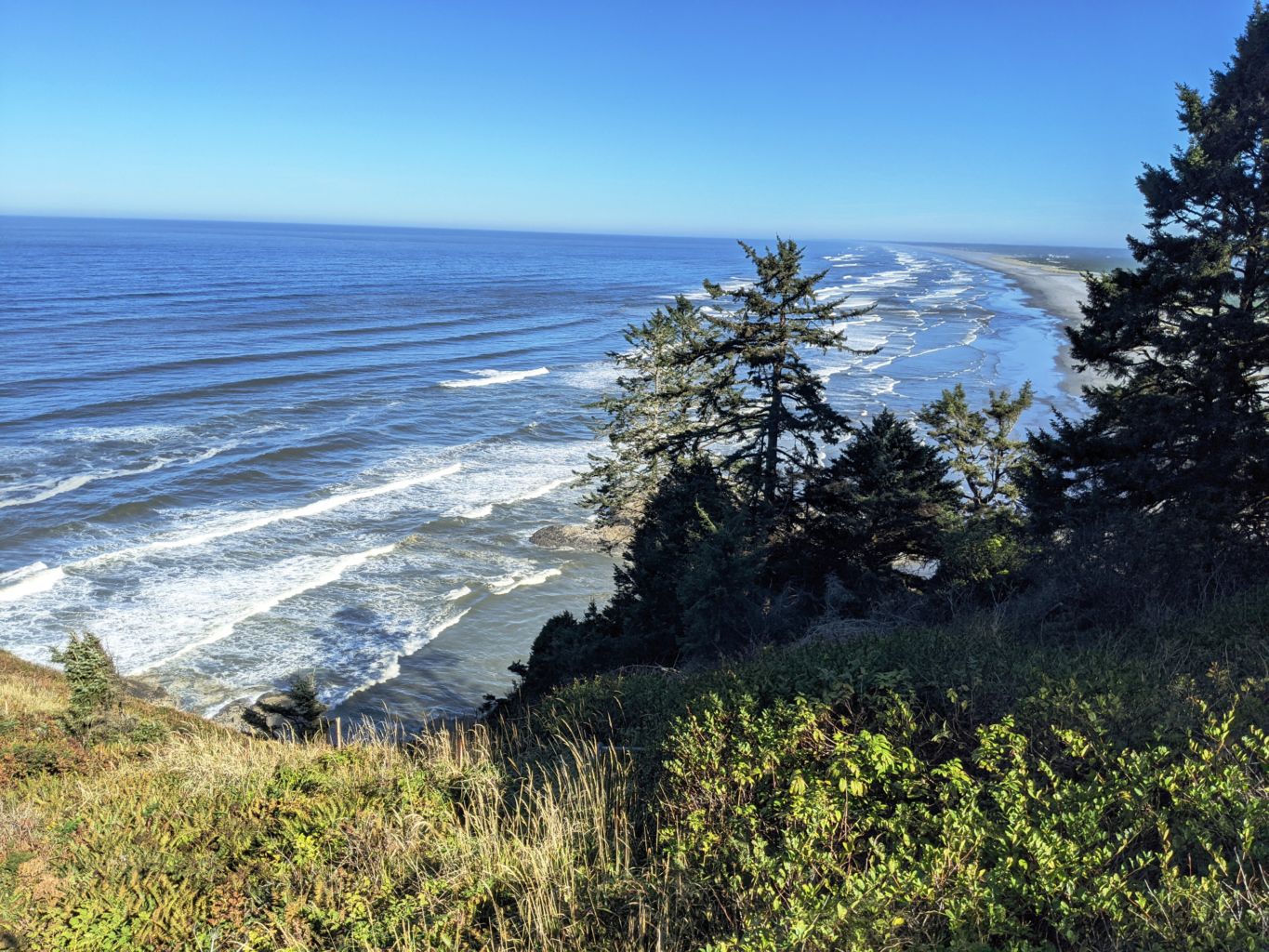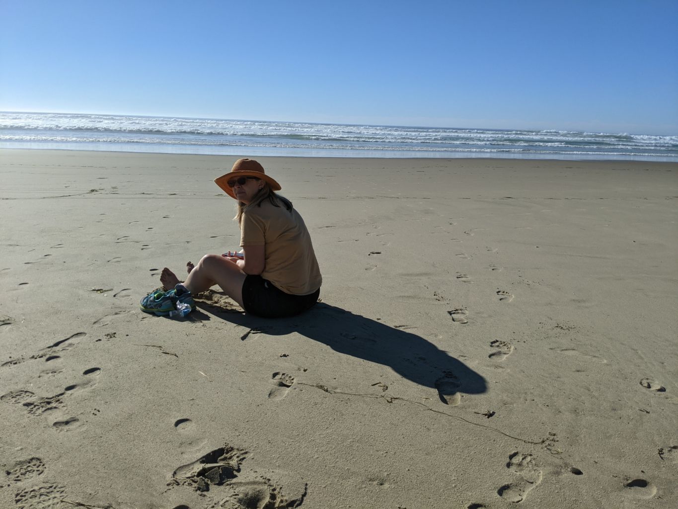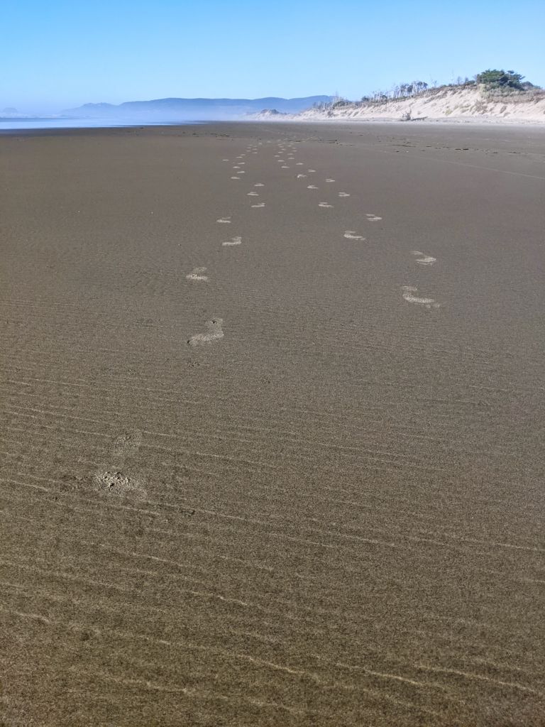 Looking at Googly now, I see this spit went for 5 miles to the mouth of Netarts Bay, just a sand strip about 500’ wide with a strip of coastal vegetation on the east side shaped like a lamb rib, super narrow at the campground end and fairly substantial by the time you get to the mouth of the bay. With the sand so fine and firm, it would have been great to get to the mouth, but that will have to wait for another day. We had a wonderful walk along the beach; a perfect re-introduction to the coast and a perfectly relaxing afternoon.