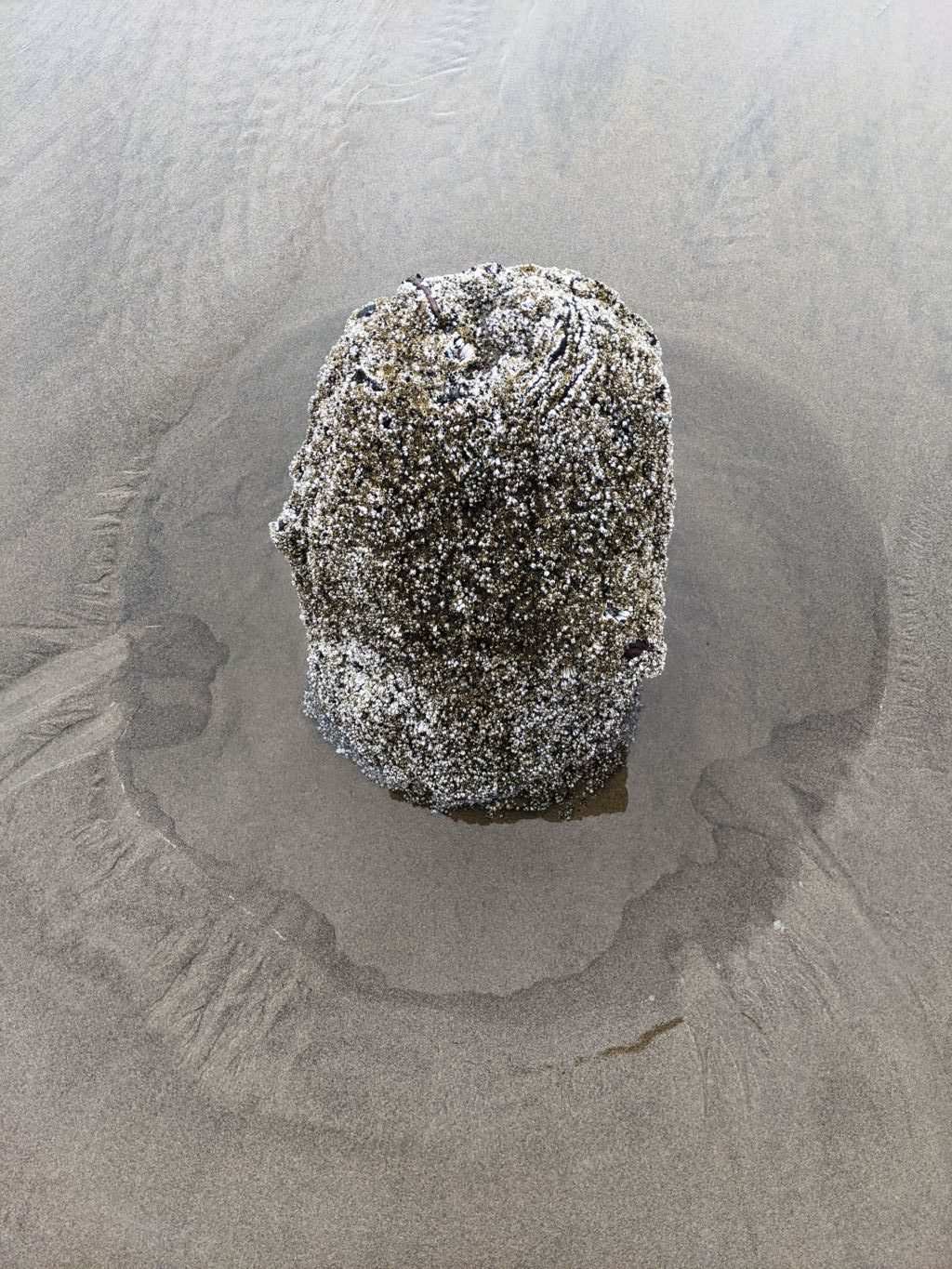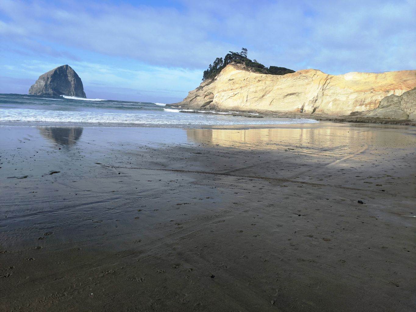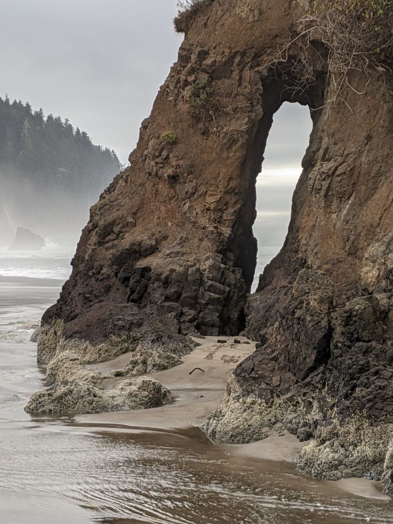 We gave it a good try, but with the day getting pretty long, we just stopped and parked, and walked down the trail and stairs to the sandy strip of Neskowin Beach. Proposal Rock sits on the beach, a very cool and rather different kind of lone island or stack because it is literally on the beach; it isn’t inaccessible out in the water surrounded by waves and surf. Neskowin Creek runs right to it, across the sandy beach but on the surface, nt absorbed into the sand. When it hits Proposal rock, it splits in half, some of the creek going around the North side of the rock and some very equal amount heading around the south apron.