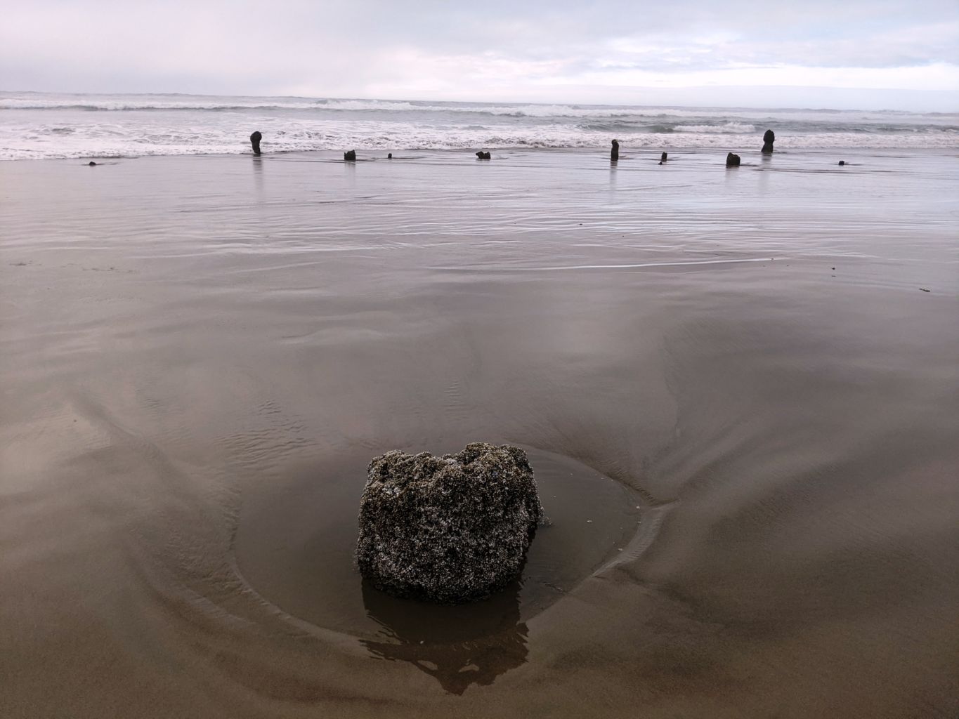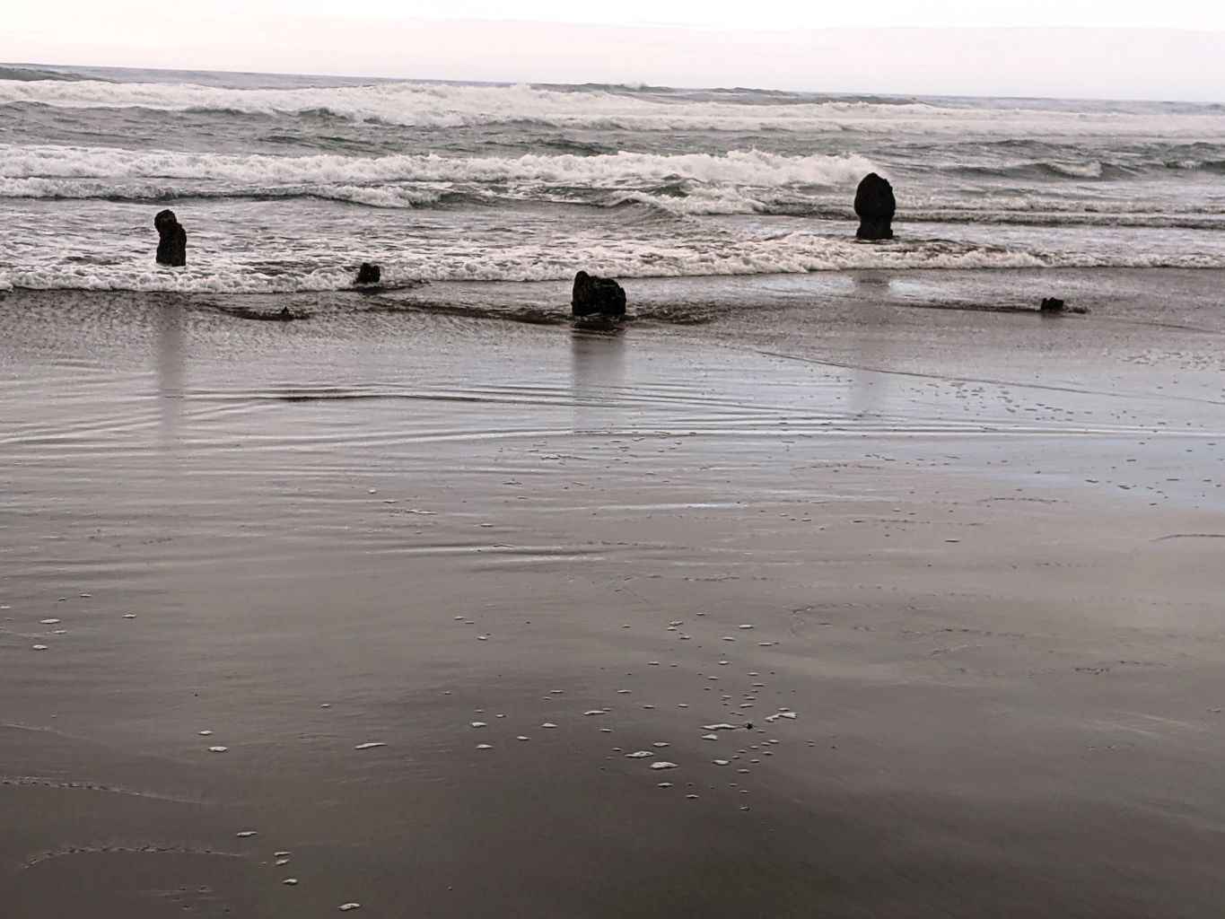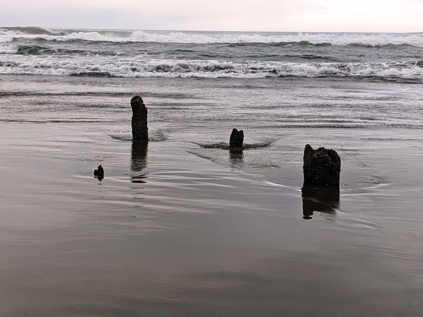 This was reward enough, but we still hadn’t found the “Ghost Forest”. We took our shoes off to cross over Neskowin creek in the middle of the beach and walked South where I recall the ancient tree stumps were. We eventually saw them in the growing dusk of the long day. There were hardly any stumps left, nothing like the picture I saw from some distant time, but it was still very cool, and I was super happy to have found it. We stayed on the beach quite some time, barefoot in the surf, taking lots of pictures, and enjoying another awesome day on the Oregon Coast. This was a special spot.