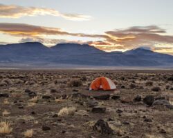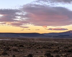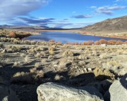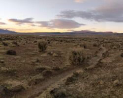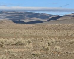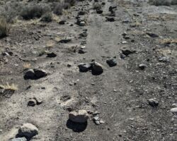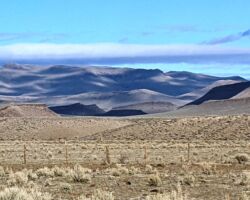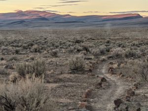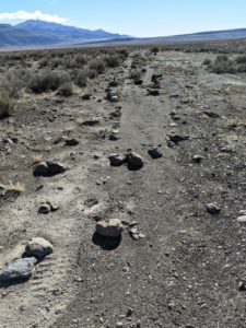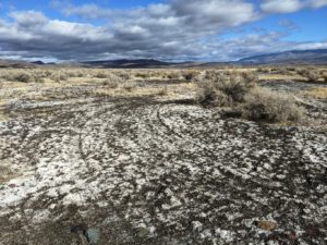 Completely out in the open, nary a shrub or sage bush higher than a knee cap, out on a massive broad slope, we had climbed again in elevation and almost got us tucked up against the low hills behind us. We had unbroken views all the way back to Mudd Meadows, Soldier Meadows, and the mountains bordering the playa. There was plenty of open space as the vegetation was pretty thin. BLM had done a great job of outlining roads, trails, and sites with small rocks, and while I was ready to jump into the first site, which turned out not even to be a site, just the info center, we jumped into the next one, not a sole in sight, no evidence of humans other than what could have been from years and years ago. We had found our place.