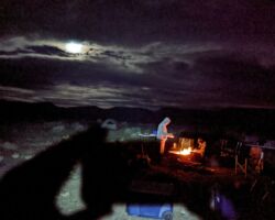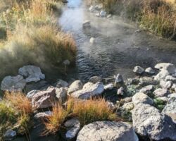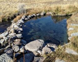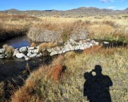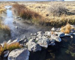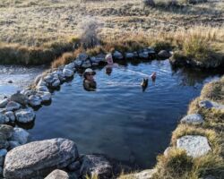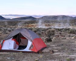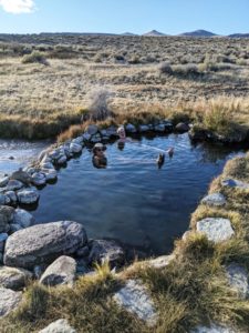 At some point after dinner, Billy wandered down to the hot springs. We hooted and hollered from camp every once in a while to make sure we got a response. Eventually we headed down to see where he was and he had found another pool, a little lower down the hot creek. He was in his glory. We headed back to camp and Kenny crashed before too long. Bobby and I hung around the fire until Billy returned when we all retired to our separate individual tents. Sleep was rare and infrequent.