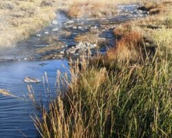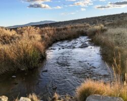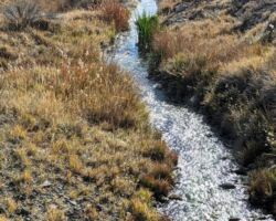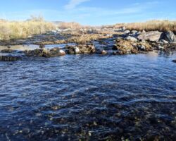I got out of the spring and in just my sandals, I followed the trail Ken had explored earlier in the morning. The stream had a number of pools, perhaps 8, until it seemed to disappear. A distance beyond, it reemerged from the ground to bubble up in a thick muck that eventually cleared back up as it fell down the slope and through the grasses and roots and brush and became a clear stream again. Maybe a mile or so down, I came to the road we had come in on, maybe just a mile further down from where we turned off. The creek crossed the road and had at some time made quite a mess of it. Now tons of rock created the path that both vehicles could drive on and the creek could pass through.