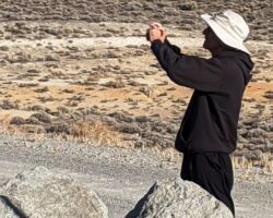 We turned around a mile or so down the road and came back to the tower, assuming we would easily find it not far from where we parked. However, we looked and looked, walked both sides of the steep banked elevated road, but somehow it disappeared. During our meandering back and forth and up and down, Bobby pulls up alongside and says “how do”. This blew our mind because Bob had texted us he was at the summit as we were at the highway 20 intersection, a good 20-30 minutes ahead of us. It turns out he stopped to visit the Pyramid Lake Museum in Nixon. He joined the search party, but somehow this plastic water bottle stumped us all and was not to be found. Eventually we gave up and headed on down the road to Gerlach.