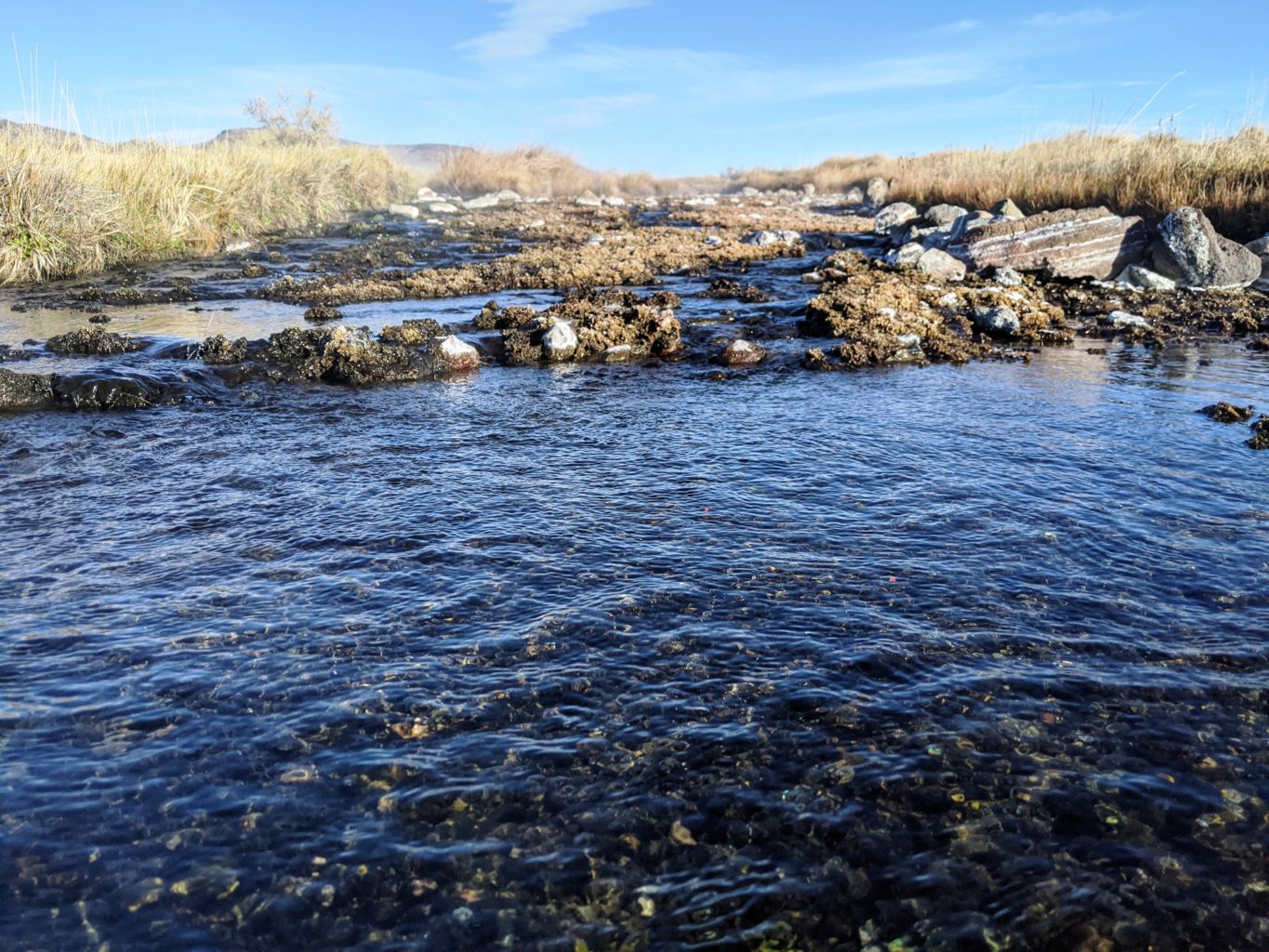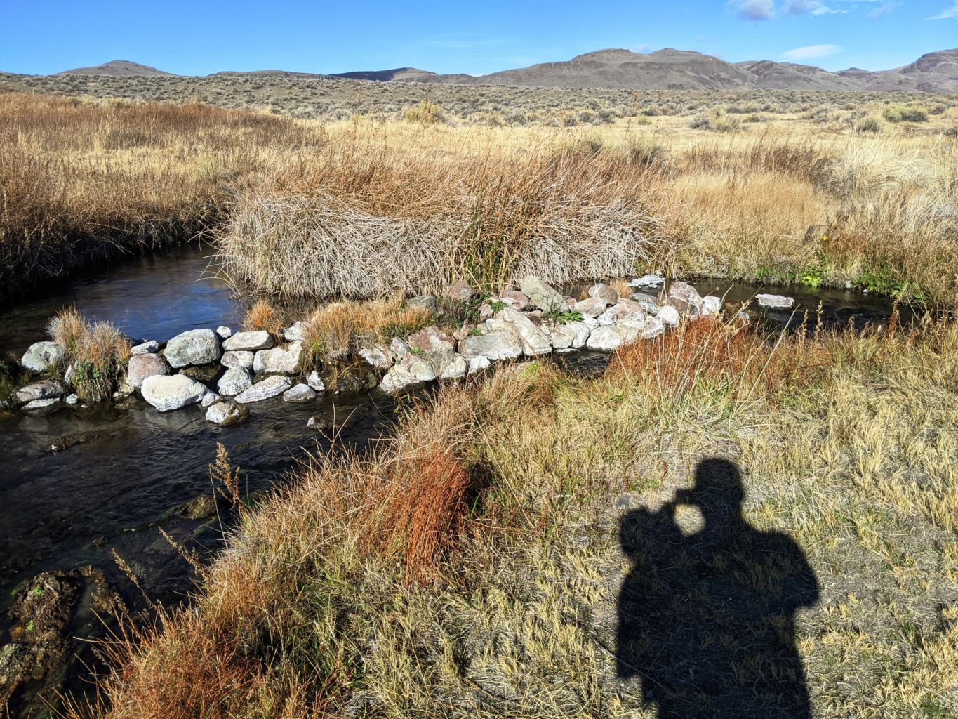 I got out of the spring and in just my sandals, I followed the trail Ken had explored earlier in the morning. The stream had a number of pools, perhaps 8, until it seemed to disappear. A distance beyond, it reemerged from the ground to bubble up in a thick muck that eventually cleared back up as it fell down the slope and through the grasses and roots and brush and became a clear stream again. Maybe a mile or so down, I came to the road we had come in on, maybe just a mile further down from where we turned off. The creek crossed the road and had at some time made quite a mess of it. Now tons of rock created the path that both vehicles could drive on and the creek could pass through.