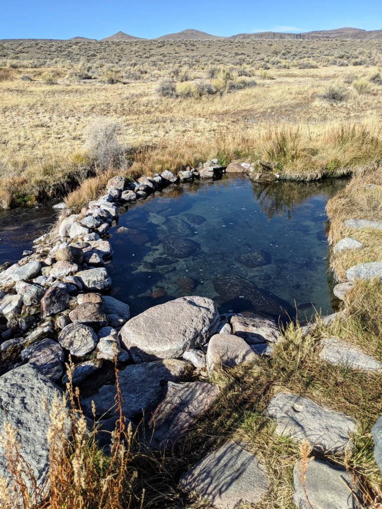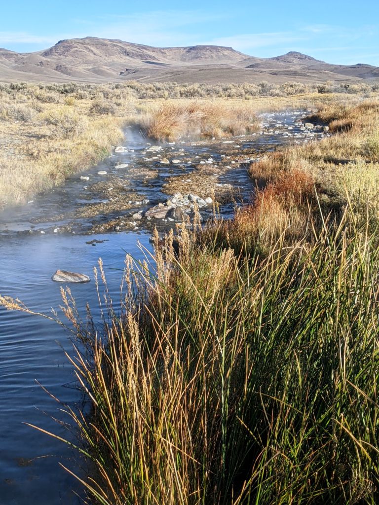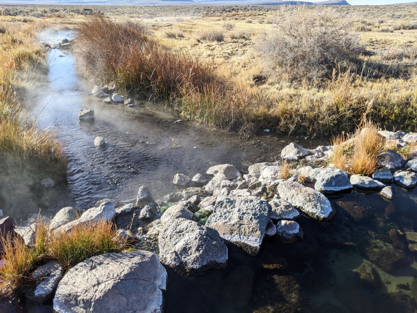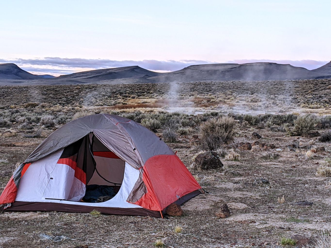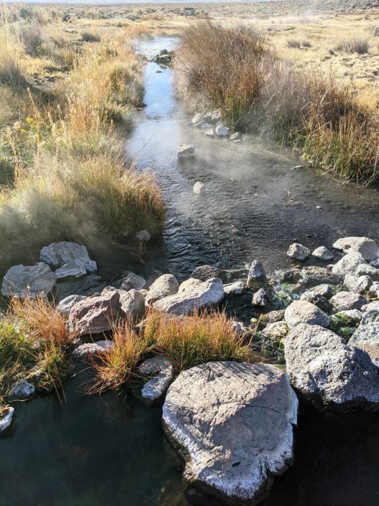 At some point after dinner, Billy wandered down to the hot springs. We hooted and hollered from camp every once in a while to make sure we got a response. Eventually we headed down to see where he was and he had found another pool, a little lower down the hot creek. He was in his glory. We headed back to camp and Kenny crashed before too long. Bobby and I hung around the fire until Billy returned when we all retired to our separate individual tents. Sleep was rare and infrequent.
