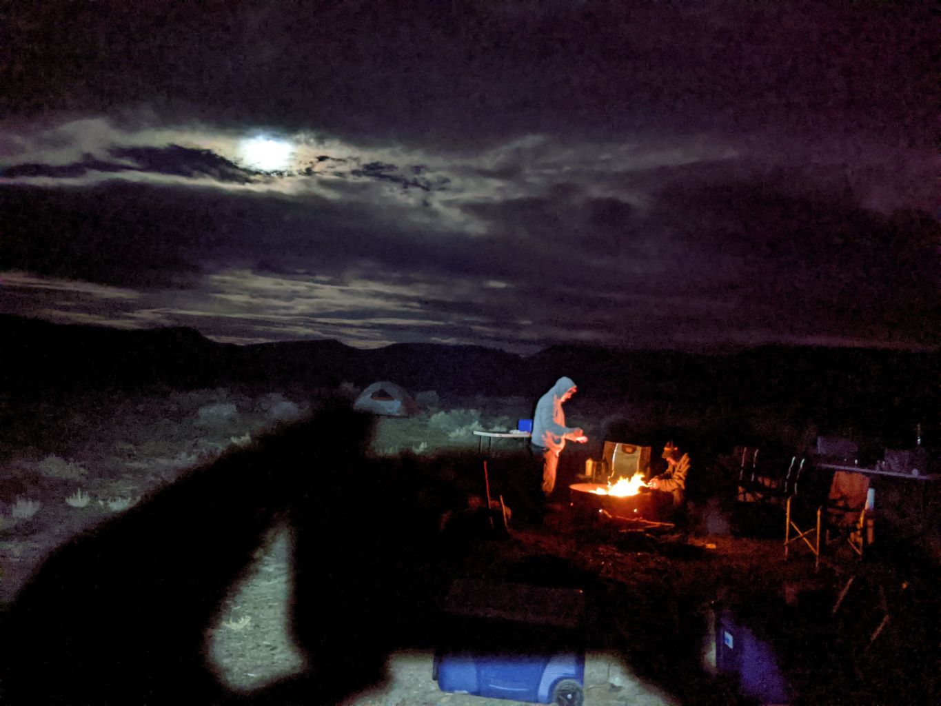 Before doing anything, I flung myself down a rock lined trail, much like those at Saline Valley in Death Valley, in hopes of finding a hot spring. Oh boy did I. The trail ended right at a very nice rocky bottom, dammed pool, with a sweet rock bench and stepping stones for easy access exit. I was thrilled. Hustling back to the boys with my report, they were fast at work wetting up tents and then getting camp ready. It was dark by now and headlamps and lanterns were called for duty. The boys speed and efficiency was impressive. We had a fire and kitchen up in no time and a celebratory beverage. Kenny was aiming high to fill Tommy’s shoes and had made a canteen of Manhattan’s. The boys consumed them in one sitting. Bob volunteered for whip up dinner and soon we had a smorgasbord of taco fixings. It was most excellent.