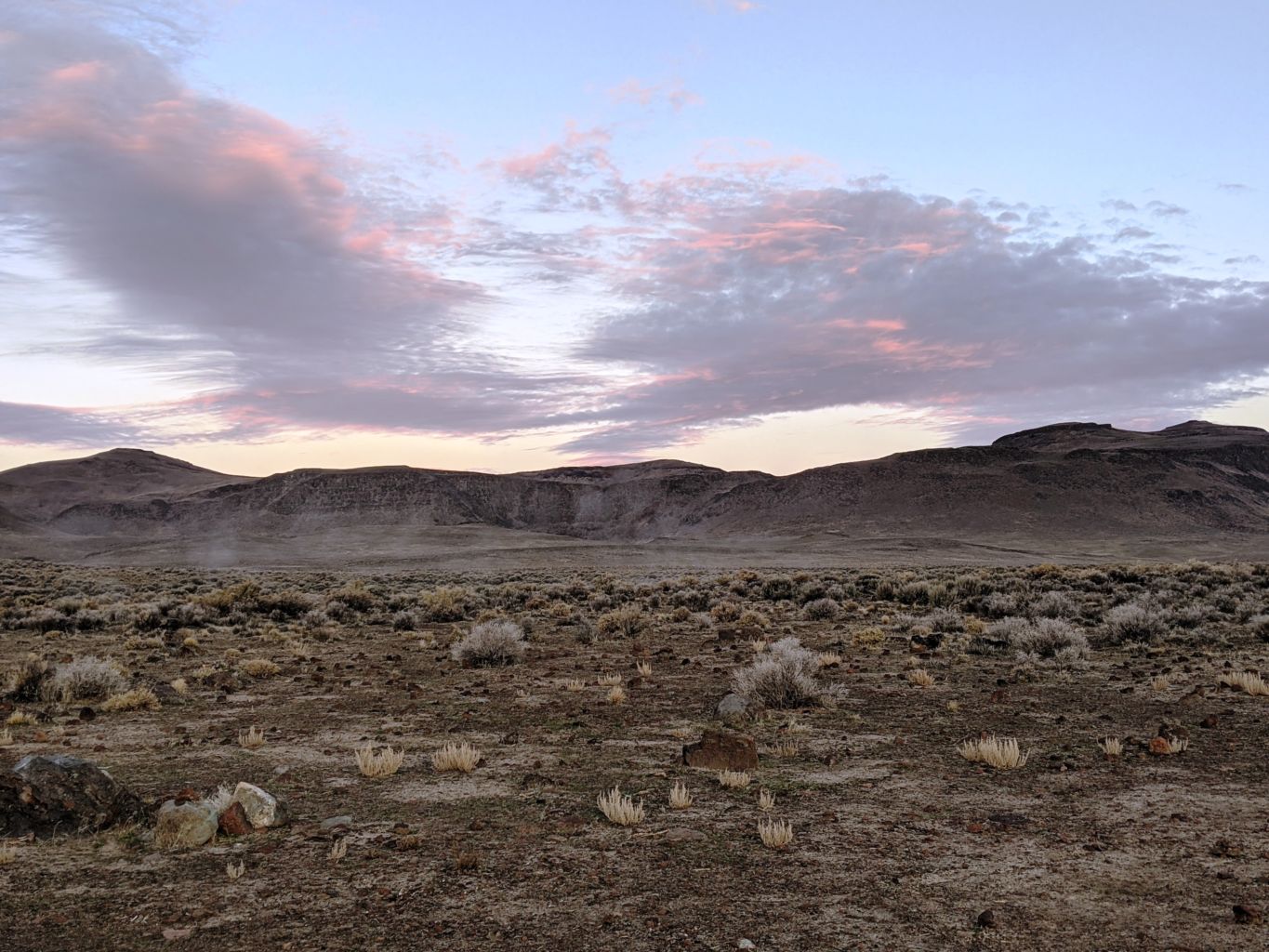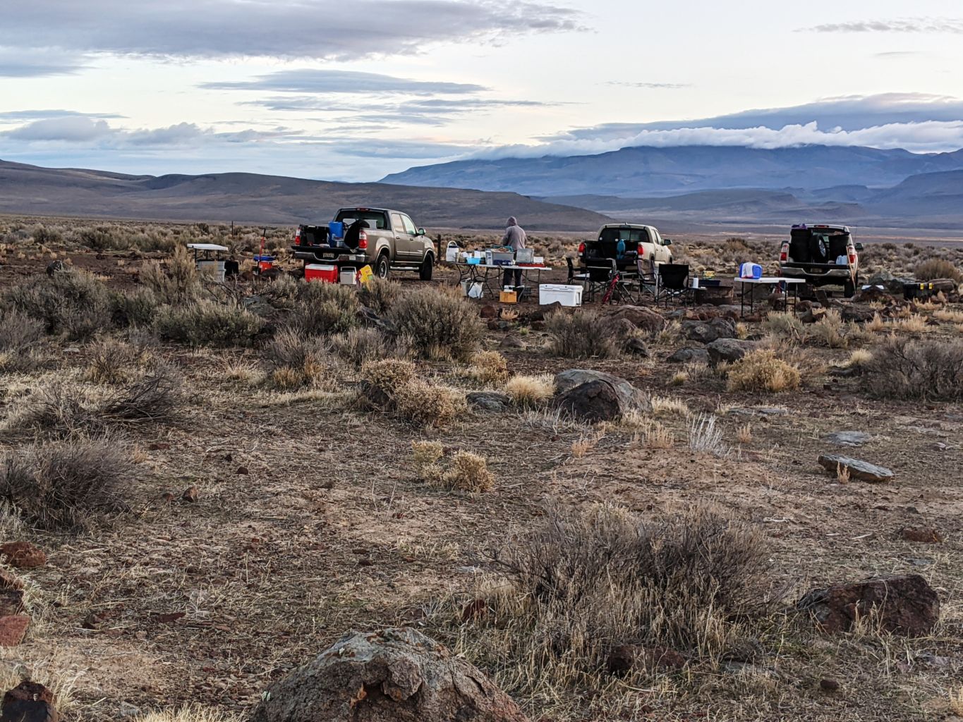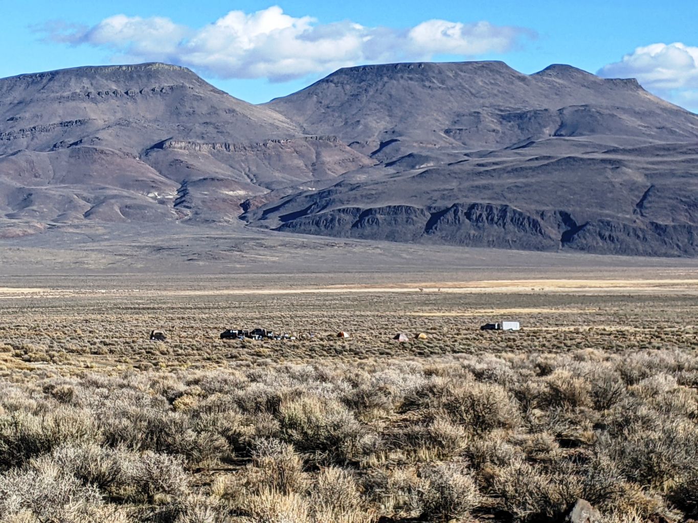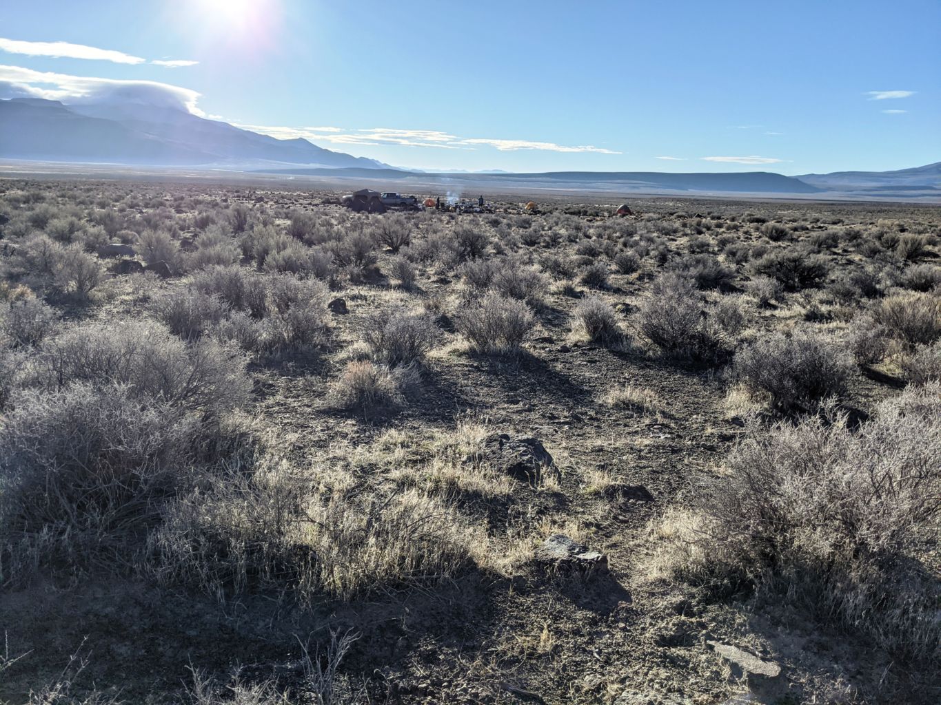Completely out in the open, nary a shrub or sage bush higher than a knee cap, out on a massive broad slope, we had climbed again in elevation and almost got us tucked up against the low hills behind us. We had unbroken views all the way back to Mudd Meadows, Soldier Meadows, and the mountains bordering the playa. There was plenty of open space as the vegetation was pretty thin. BLM had done a great job of outlining roads, trails, and sites with small rocks, and while I was ready to jump into the first site, which turned out not even to be a site, just the info center, we jumped into the next one, not a sole in sight, no evidence of humans other than what could have been from years and years ago. We had found our place.