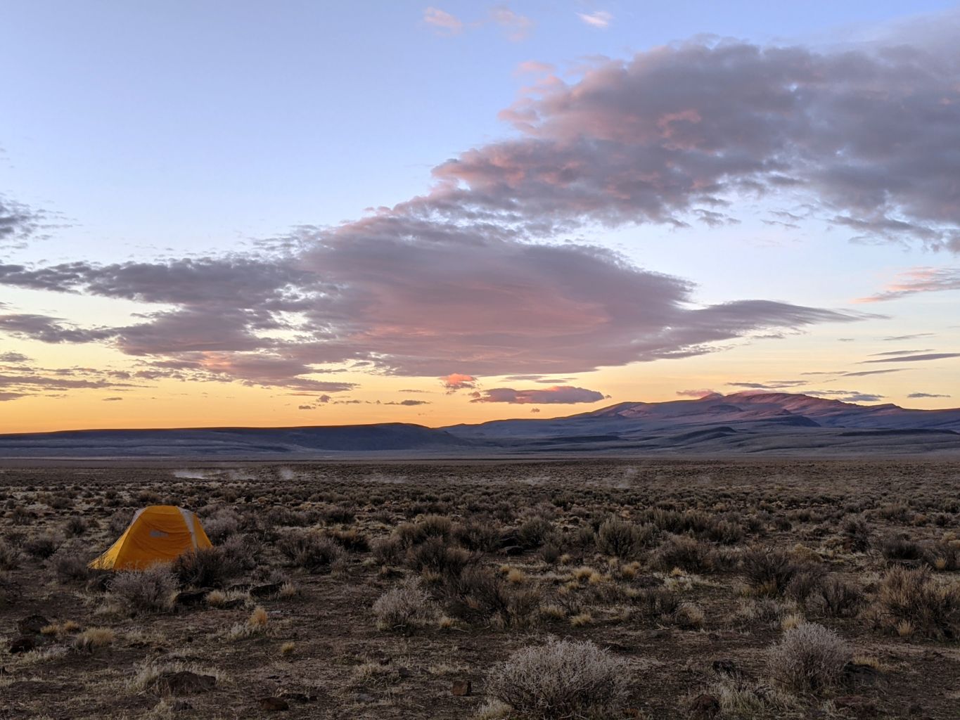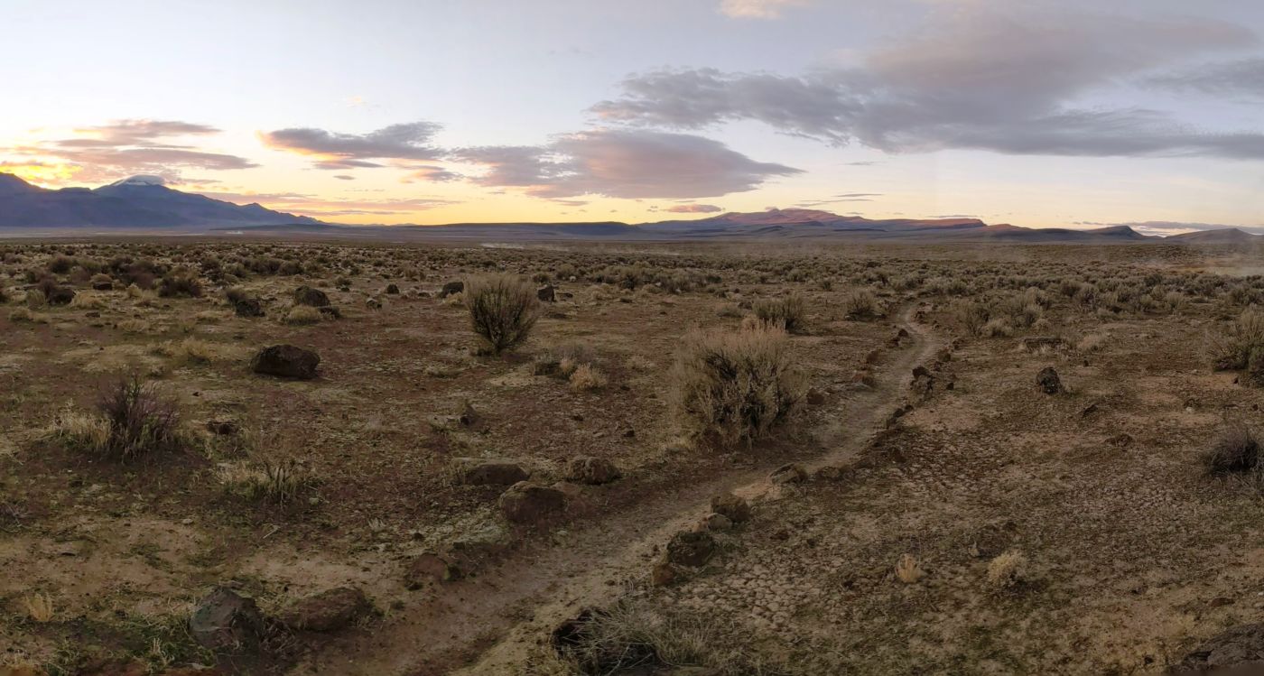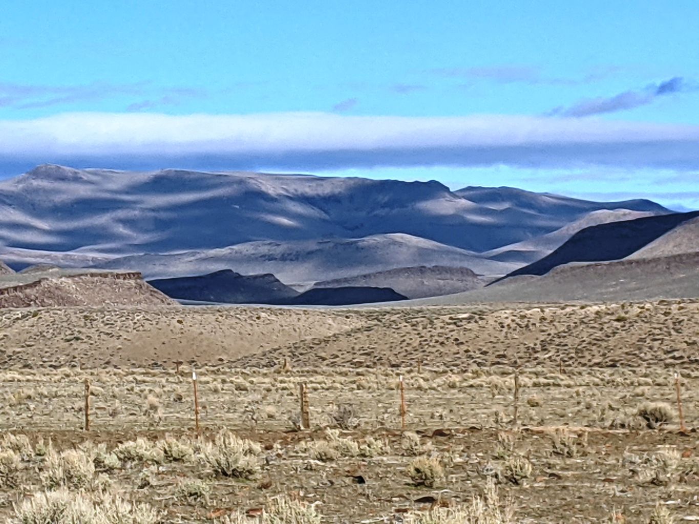 Completely out in the open, nary a shrub or sage bush higher than a knee cap, out on a massive broad slope, we had climbed again in elevation and almost got us tucked up against the low hills behind us. We had unbroken views all the way back to Mudd Meadows, Soldier Meadows, and the mountains bordering the playa. There was plenty of open space as the vegetation was pretty thin. BLM had done a great job of outlining roads, trails, and sites with small rocks, and while I was ready to jump into the first site, which turned out not even to be a site, just the info center, we jumped into the next one, not a sole in sight, no evidence of humans other than what could have been from years and years ago. We had found our place.