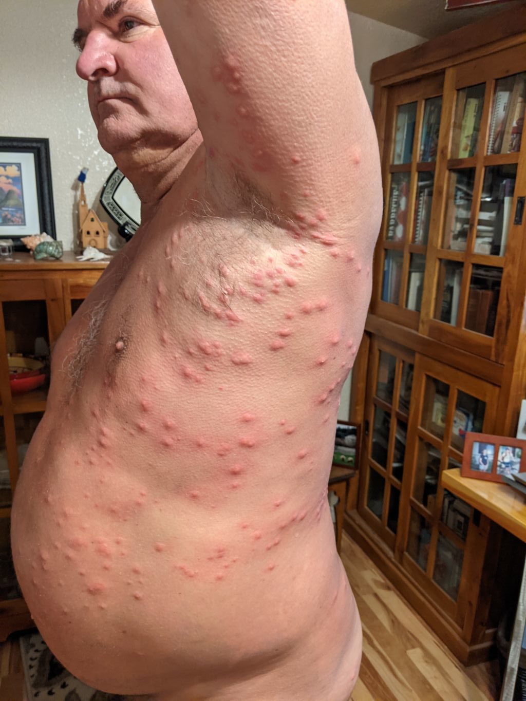 Once we got onto 80 and through Reno, traffic opened up and we made a pit stop in Truckee for gas. From then on home, it was smooth sailing. It was a little later and a little darker by the time we got into town, but not bad. It only took a few minutes to unload Ken and I was home moments later. I was pretty thrashed from the drive and getting itchier by the minute. K was kind of rubbing my back and I mentioned I felt like I had a few bites that were itching more and more. Taking off my shirt revealed hundreds of bites all over my torso, front, back, and especially around my arm pits. My legs were unscathed, but by the minute, my discomfort was skyrocketing.
