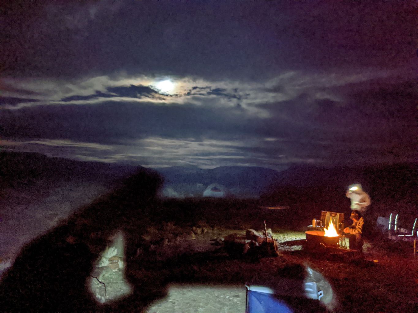In keeping with all our trips, we had 4 times the food we needed. Since Bob and Bill were staying a third night, we decided we would eat the food Ken and I brought for dinner; pork chops and eggplant. We got a fire going in the pit and another in the Weber bottom I brought, and in a first, in my memory anyway, we heated up briquettes on a grill over the fire. It was extraordinary and effective. Kenny BBQ’d the chops to perfection and I heated up the eggplant in the Dutch oven. The boys were satisfied. I shared a bottle of the 2018 Storelli-Hart Zin blend and then Kenny and I got into cocktails. He and I hovered around the fire for a bit, perhaps to extend the night a little longer with a morning departure already encroaching on our minds.